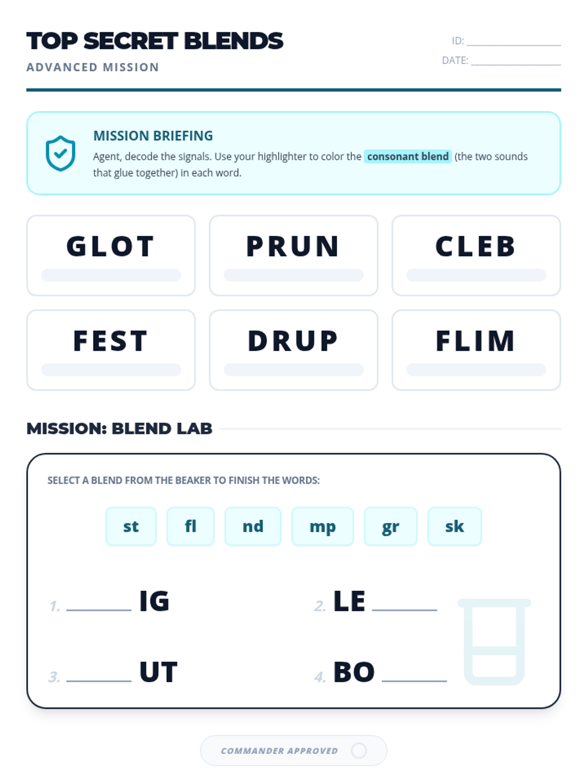 An advanced student activity sheet focusing on initial and final blends in nonsense words. Includes blend identification and a 'Blend Lab' word completion task with optimized space for handwriting.
