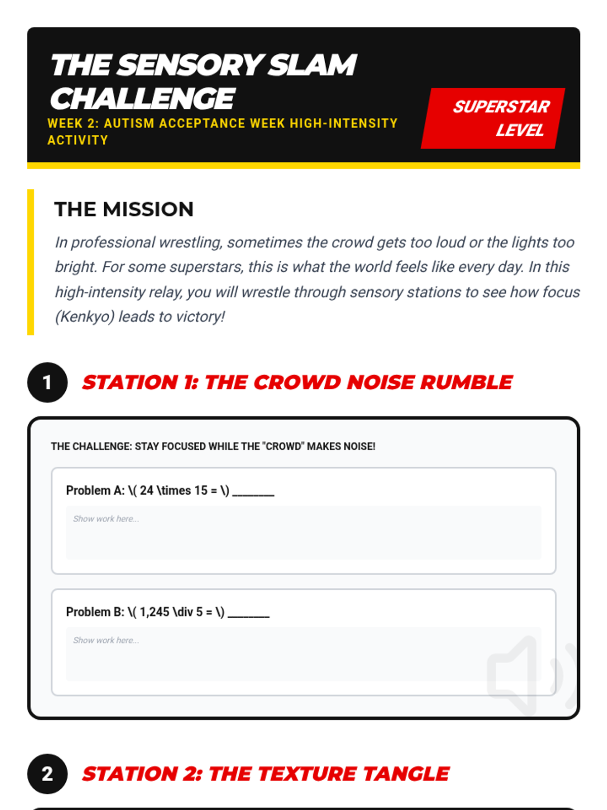 A sensory awareness activity for Autism Acceptance Week that uses high-energy challenges to simulate sensory processing differences and promote inclusive focus strategies.