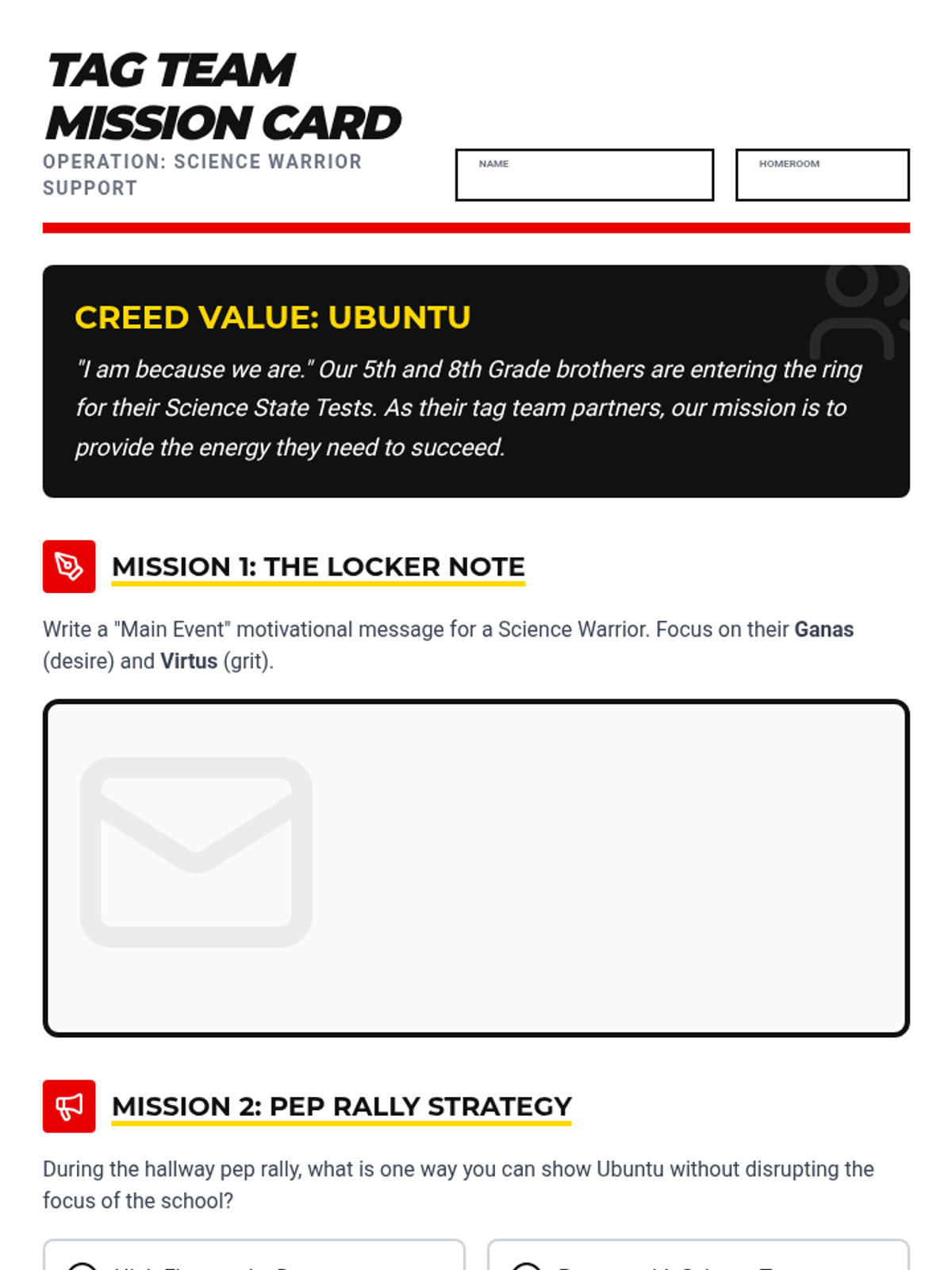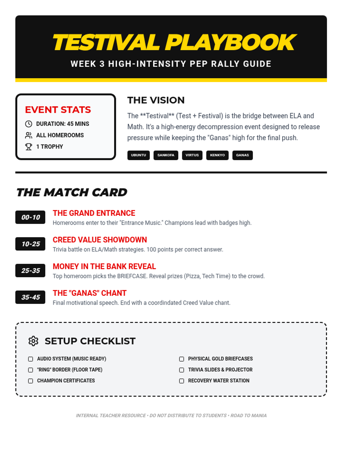 A teacher-facing resource for running a high-intensity 'Testival' (Test + Festival) pep rally, including 'Ring Entrances,' 'Creed Value Showdowns' (academic bowl style), and the 'Money in the Bank' opening.