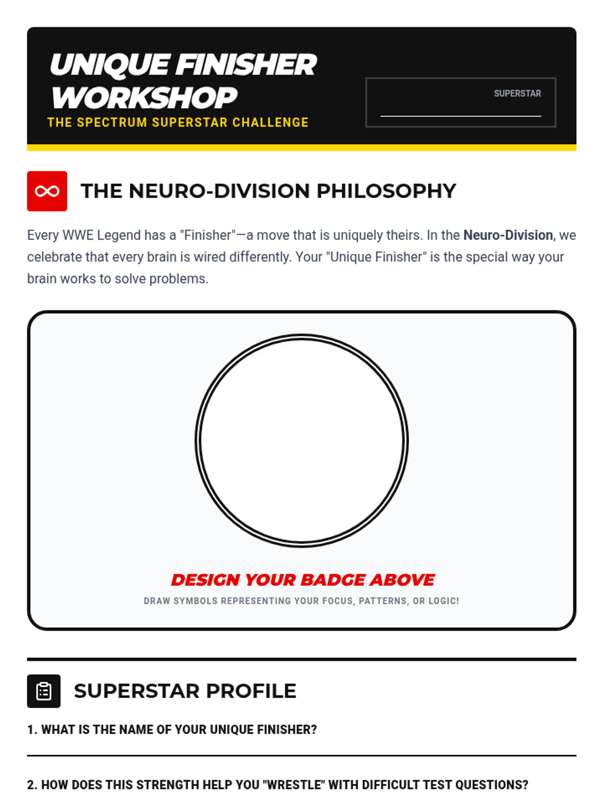 A creative student worksheet for Autism Acceptance Week where students design a 'Unique Finisher' badge representing their neurodivergent strengths and reflect on inclusive support.
