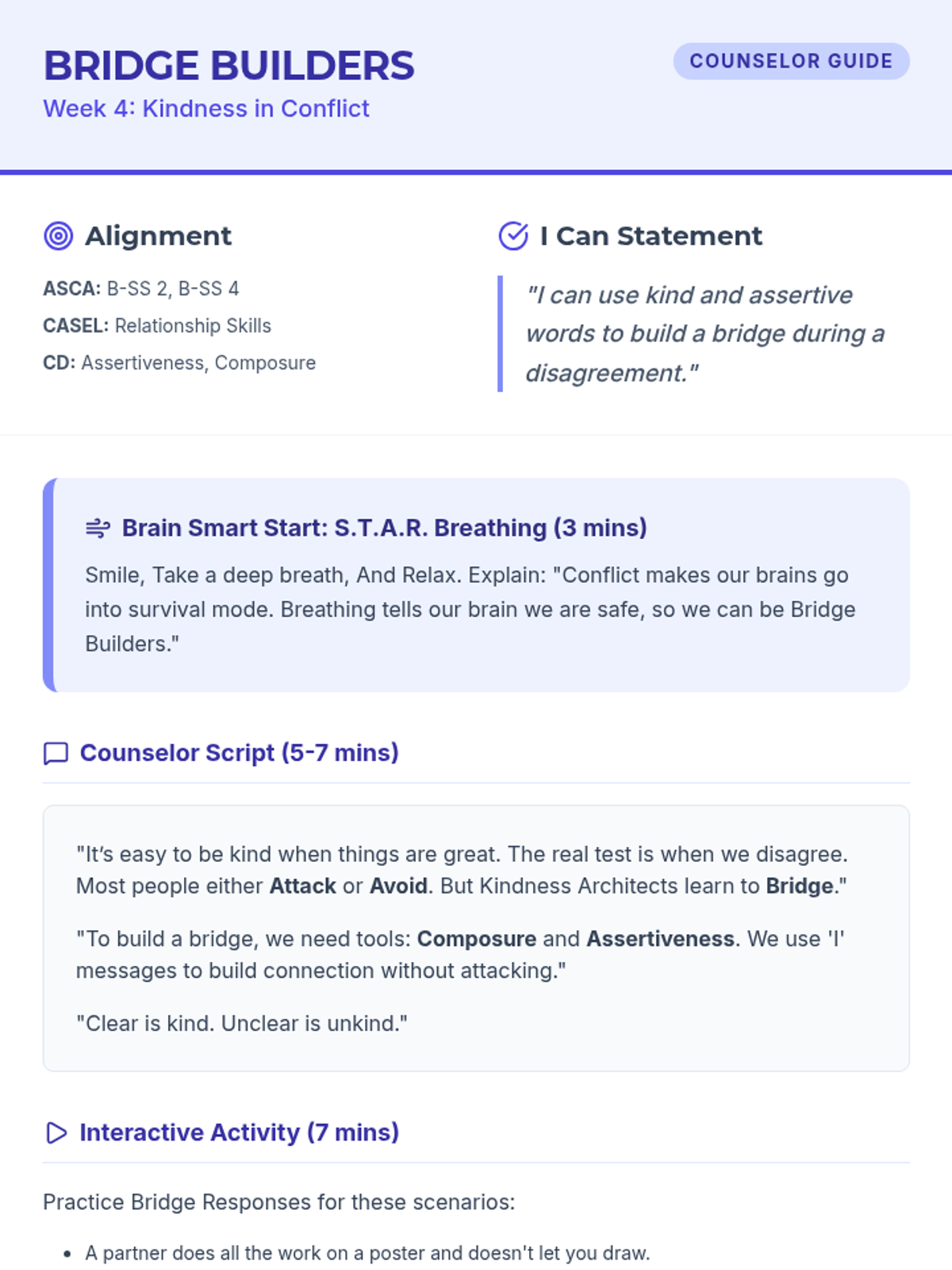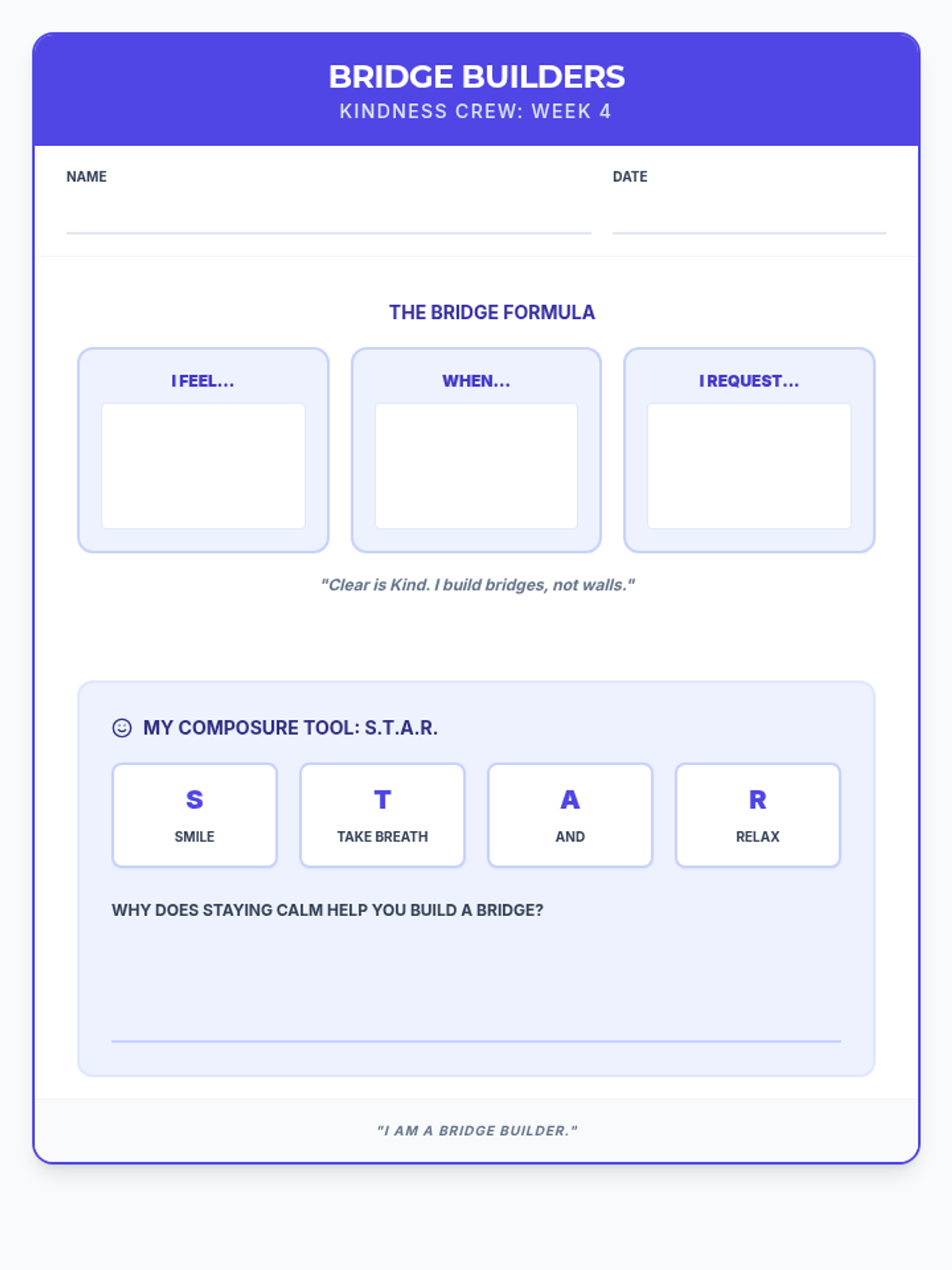 Revised student worksheet for 'Bridge Builders' with expanded writing space for the 'I' message formula.