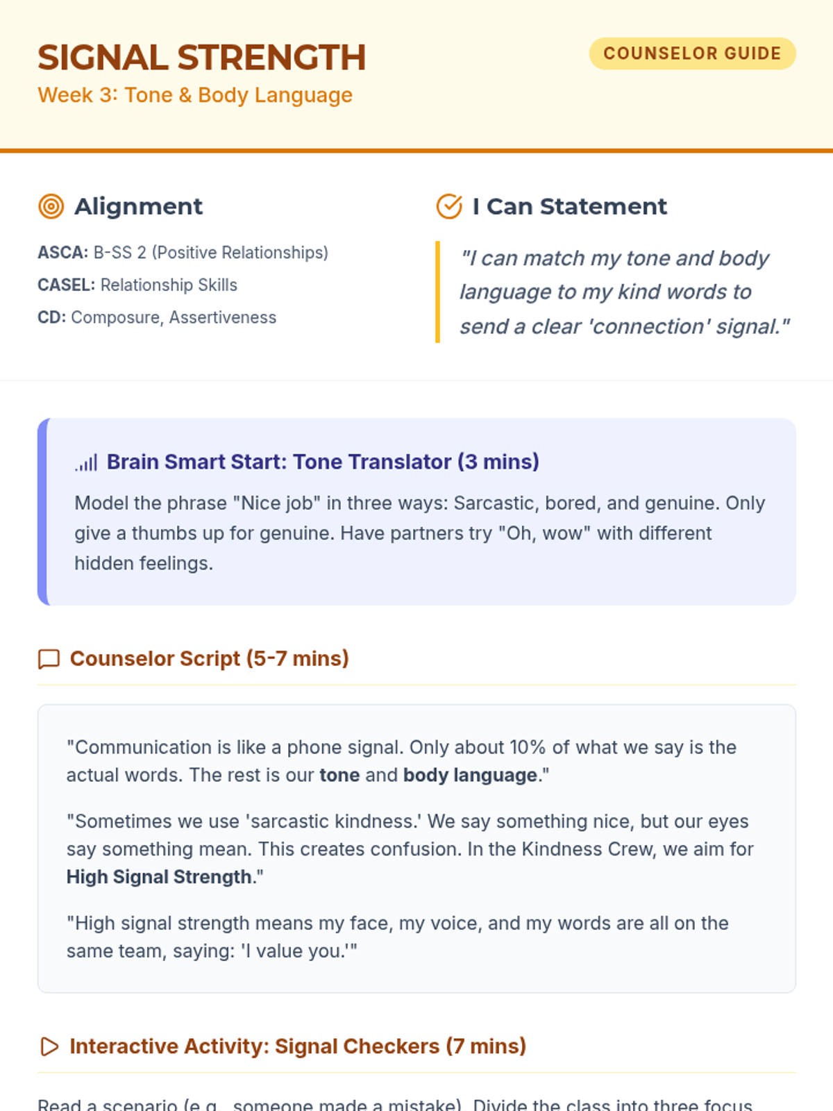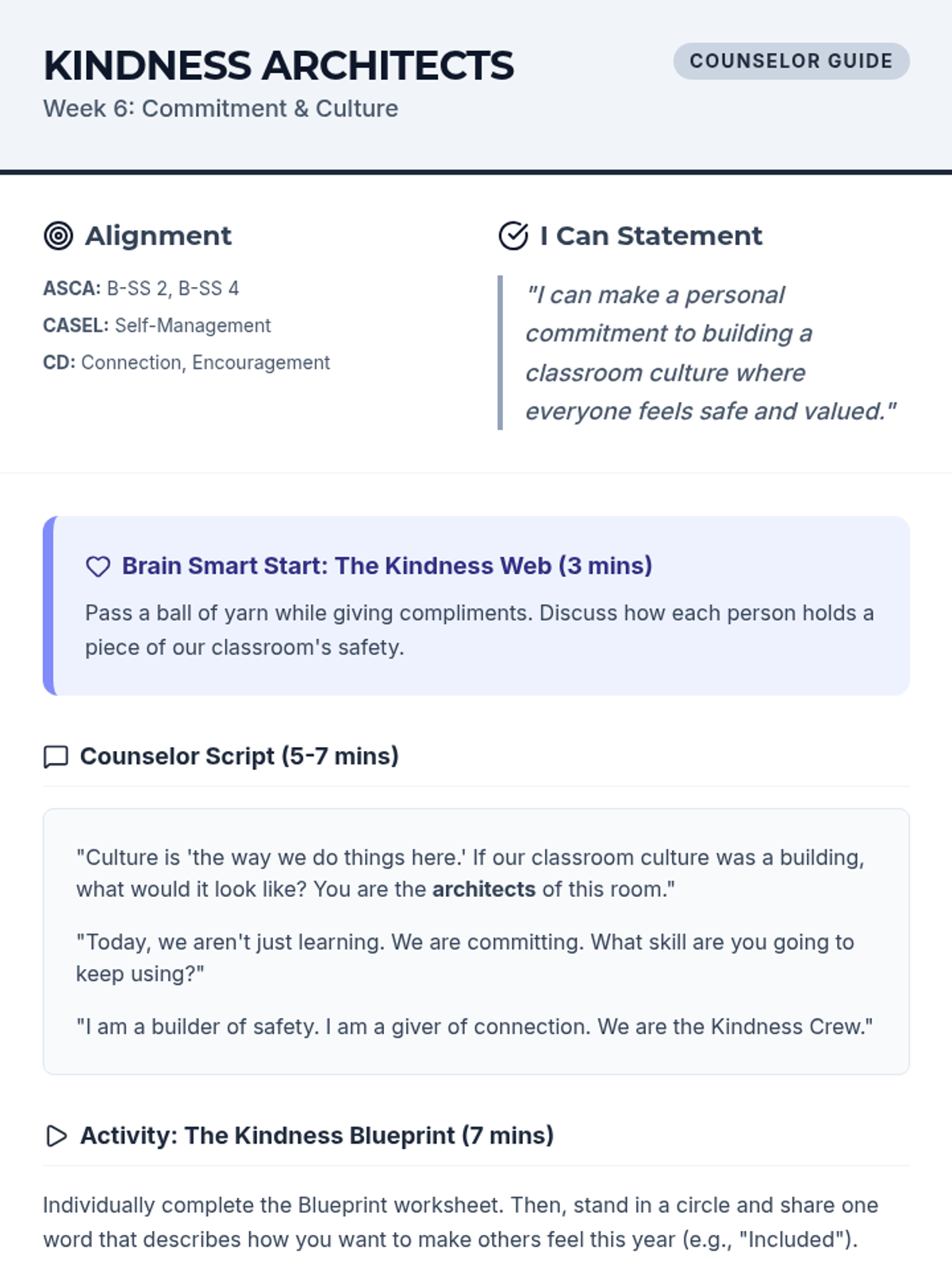 Revised Counselor guide for Week 6 with fixed layout and page-break management for the script.