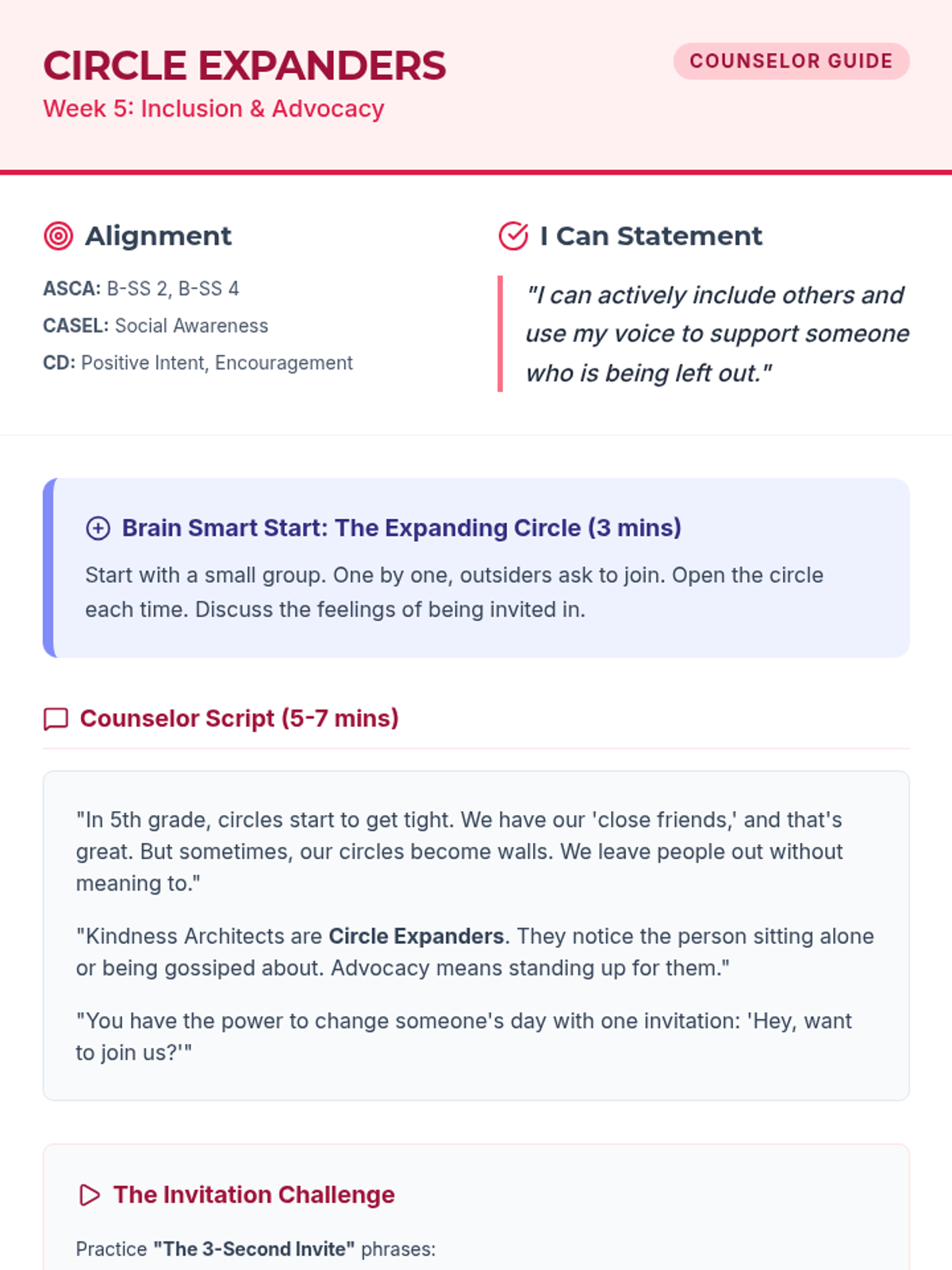 Revised Counselor guide for Week 5 with improved layout and page-break management for the script.