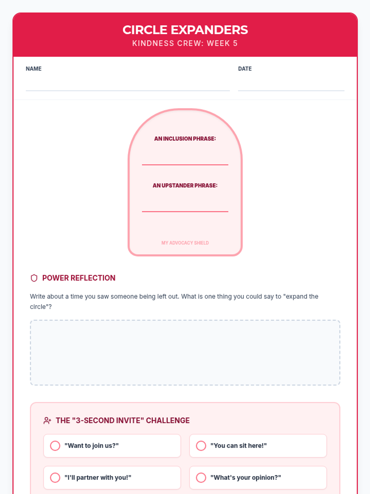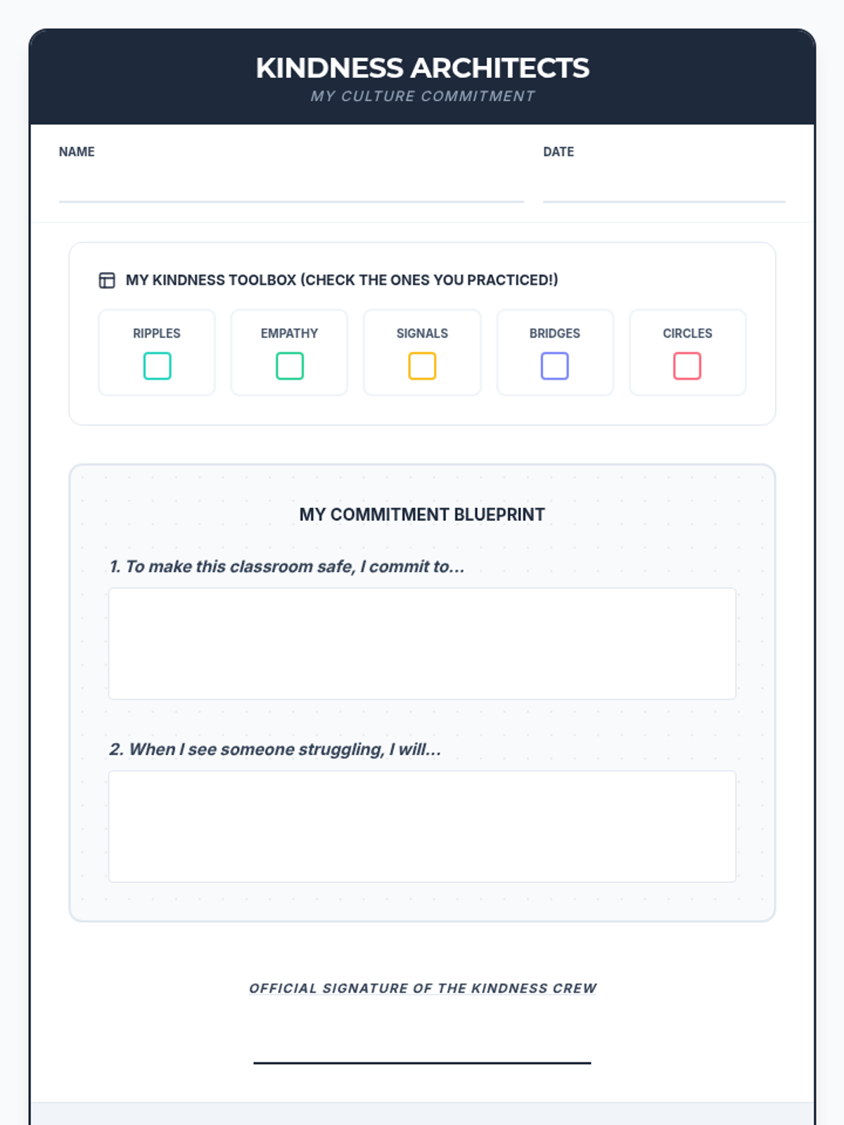 Revised student worksheet for 'Kindness Architects' with improved handwriting space and blueprint-themed design.