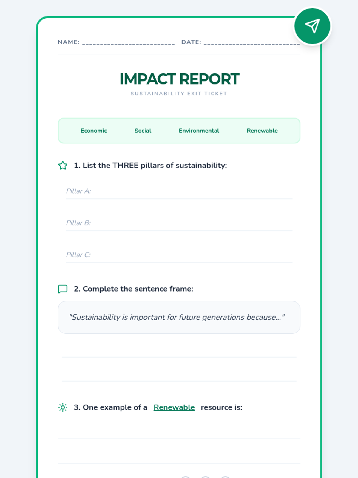 A clean, low-ink exit ticket assessment with a word bank and sentence frame to support students in identifying pillars of sustainability.