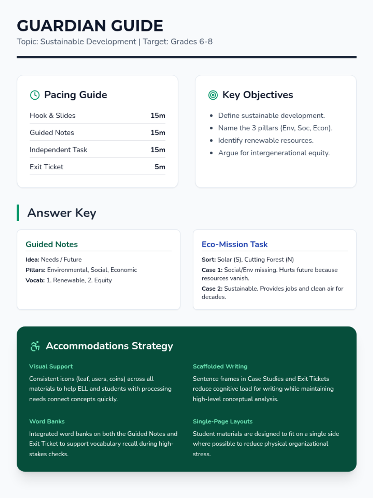 A teacher's facilitation guide with pacing, learning objectives, answer keys, and a breakdown of the integrated accommodation strategies.