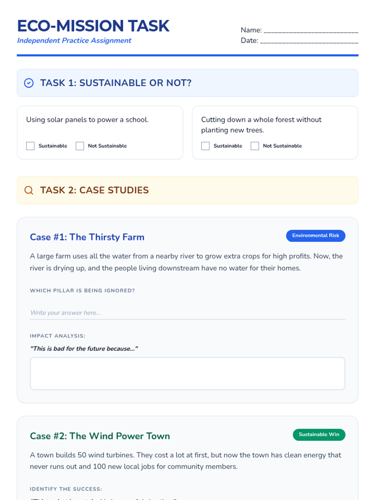 Independent practice activity featuring a sustainability sorting task and two real-world case studies with sentence frames for analysis.