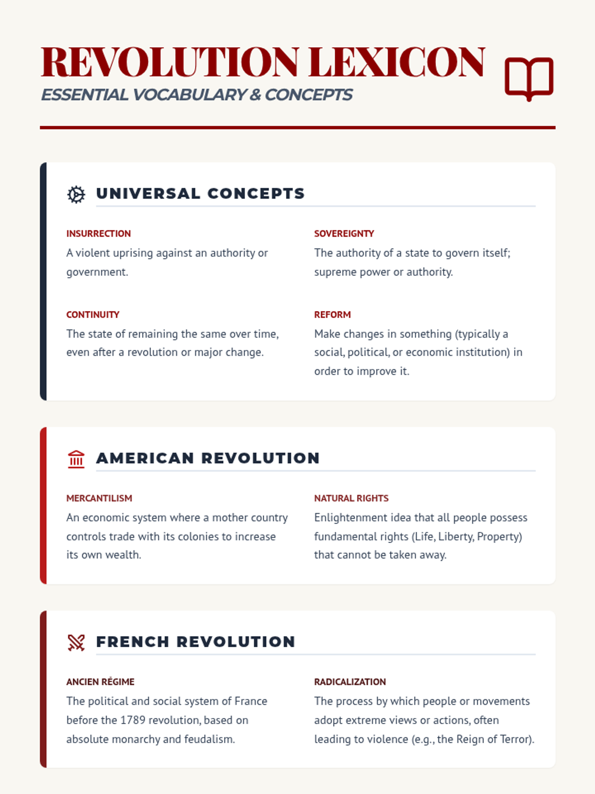 A comprehensive vocabulary reference sheet categorizing key terms and concepts for the American, French, Industrial, and Chinese Communist revolutions.