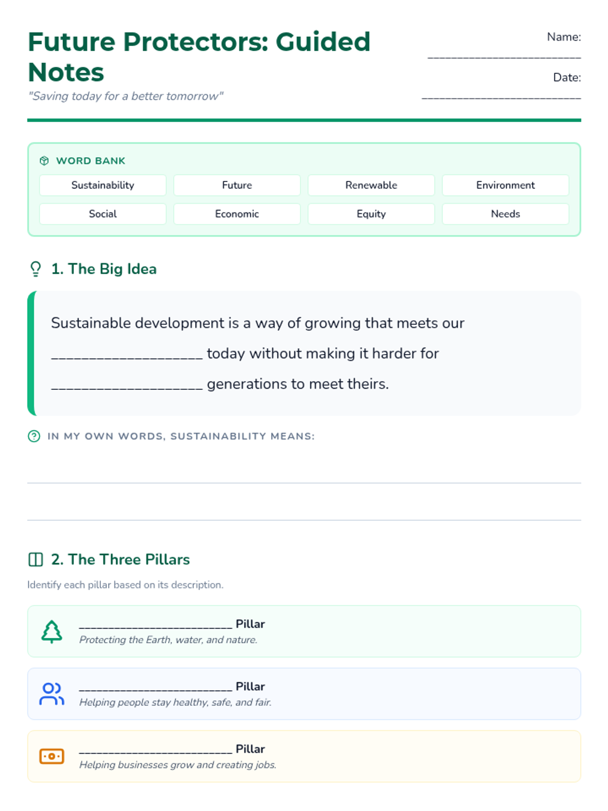 A scaffolded note-taking sheet with a word bank, visual cues, and sentence frames to support student learning during the sustainability lecture. Optimized for single-page printing.