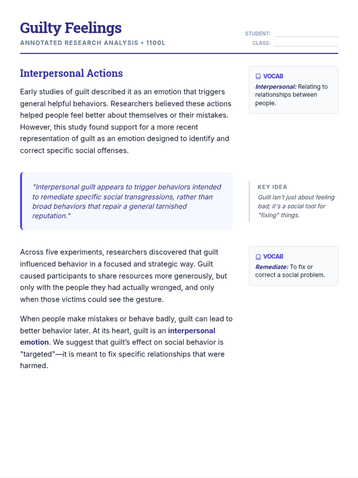 A differentiated version of the 'Guilty Feelings' handout leveled to 1100L. This version includes margin notes for vocabulary and key concepts, designed to help students track complex social psychology research findings.