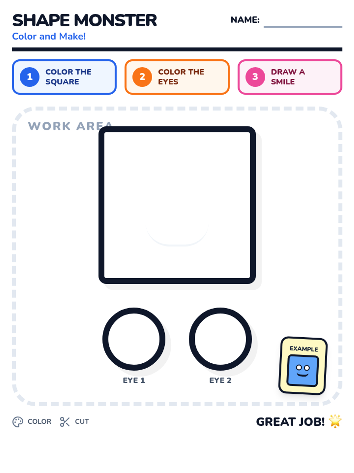 An all-in-one Shape Monster craft sheet for students with low cognitive abilities. Includes simplified 3-step instructions at the top and large, thick-bordered shapes (square and circles) for coloring, cutting, and assembly.