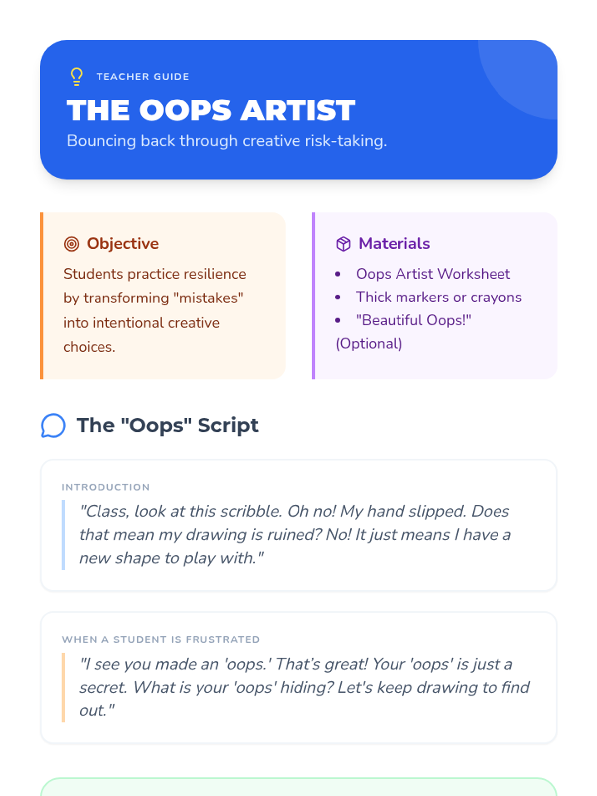 A teacher guide for facilitating the 'Oops Artist' activity, providing scripts, differentiation strategies, and learning objectives focused on resilience for first graders.