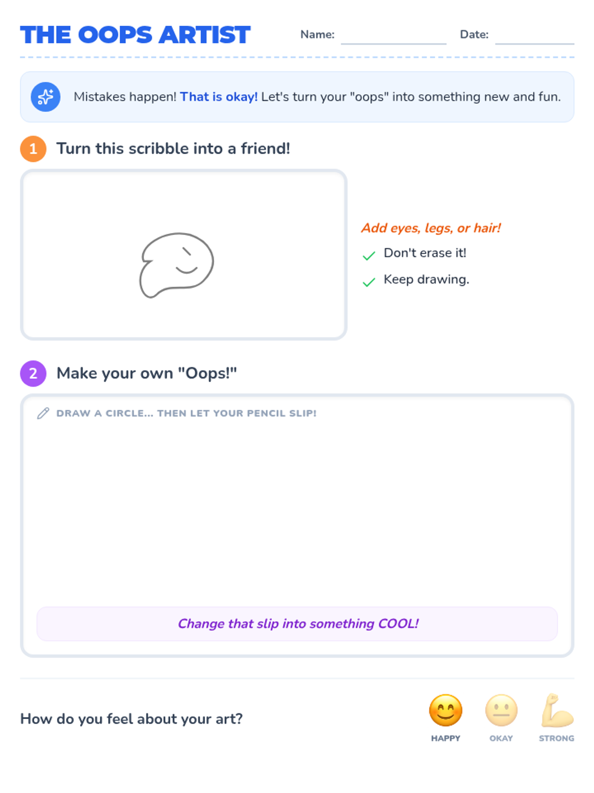 A playful drawing worksheet for first graders that encourages them to turn 'mistakes' (scribbles) into creative characters, fostering resilience and a growth mindset.