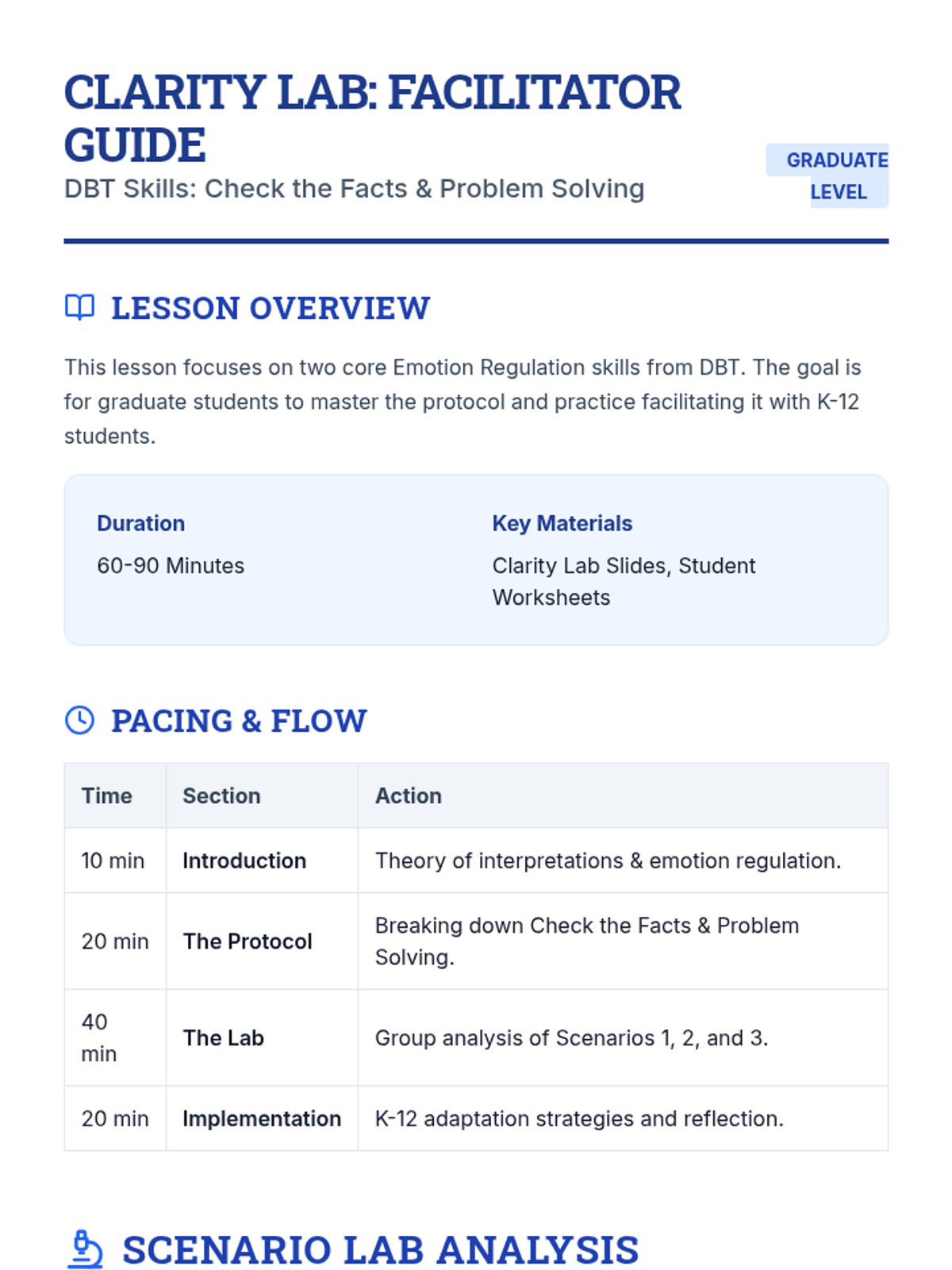 A facilitator guide for graduate instructors, providing pacing, script notes, and detailed scenario analysis for teaching DBT skills.