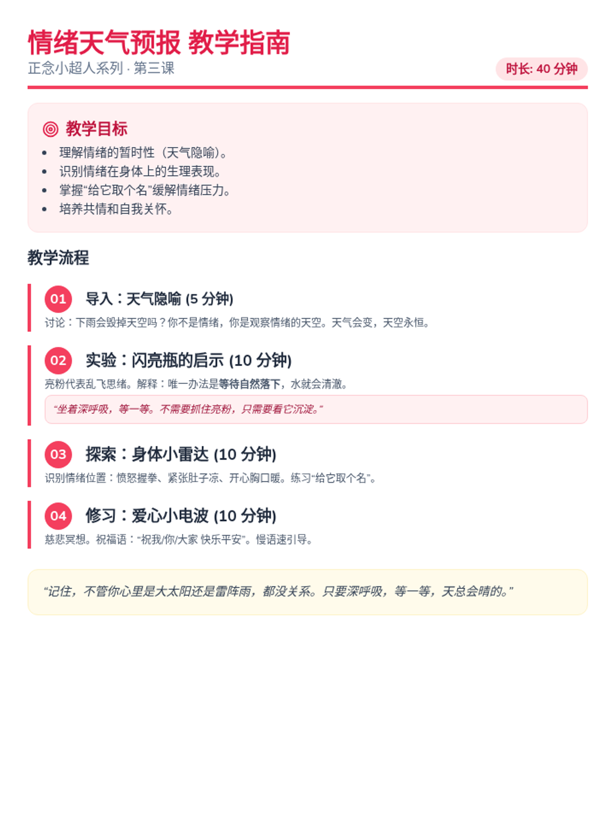 A comprehensive teacher guide for the Weather Report lesson. Revised to consolidate all content onto a single page by optimizing margins and padding. Improved visual hierarchy and icon rendering.