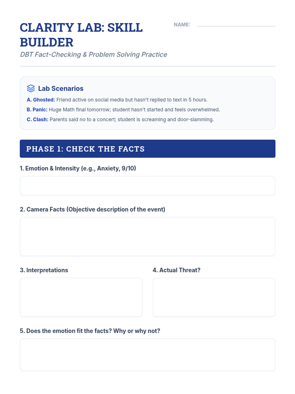 A slide deck designed for graduate students to teach DBT Check the Facts and Problem Solving skills, featuring three school-based scenarios for group analysis.