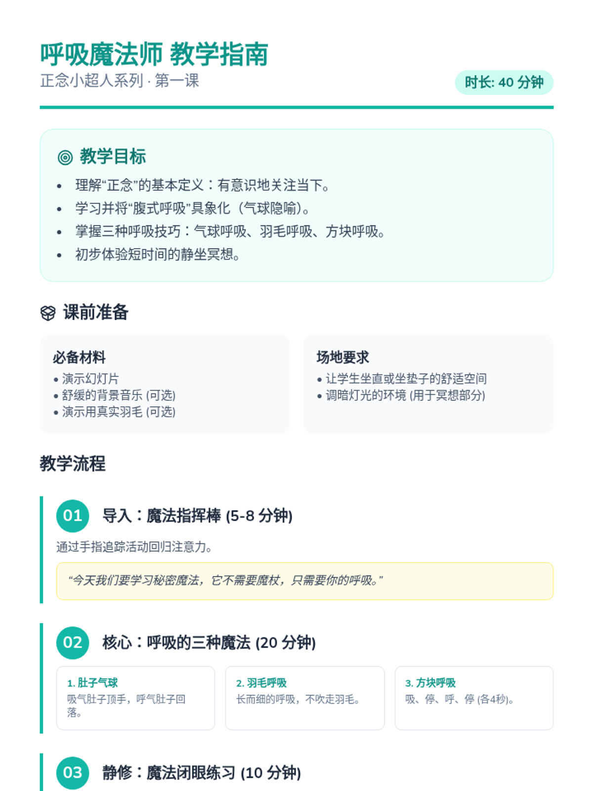 A vibrant slide deck for Lesson 1, introducing children to mindful breathing through metaphors like balloons, feathers, and square breathing. Includes guided instructions and reflection prompts. Revised to fix text wrapping, corner label weight, and punctuation orphaning.