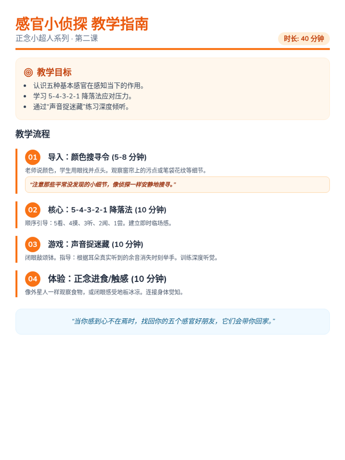 A teacher guide for the Sensory Scout lesson. Revised to fit all content on a single page by adjusting padding and spacing while ensuring all instructional steps remain intact.