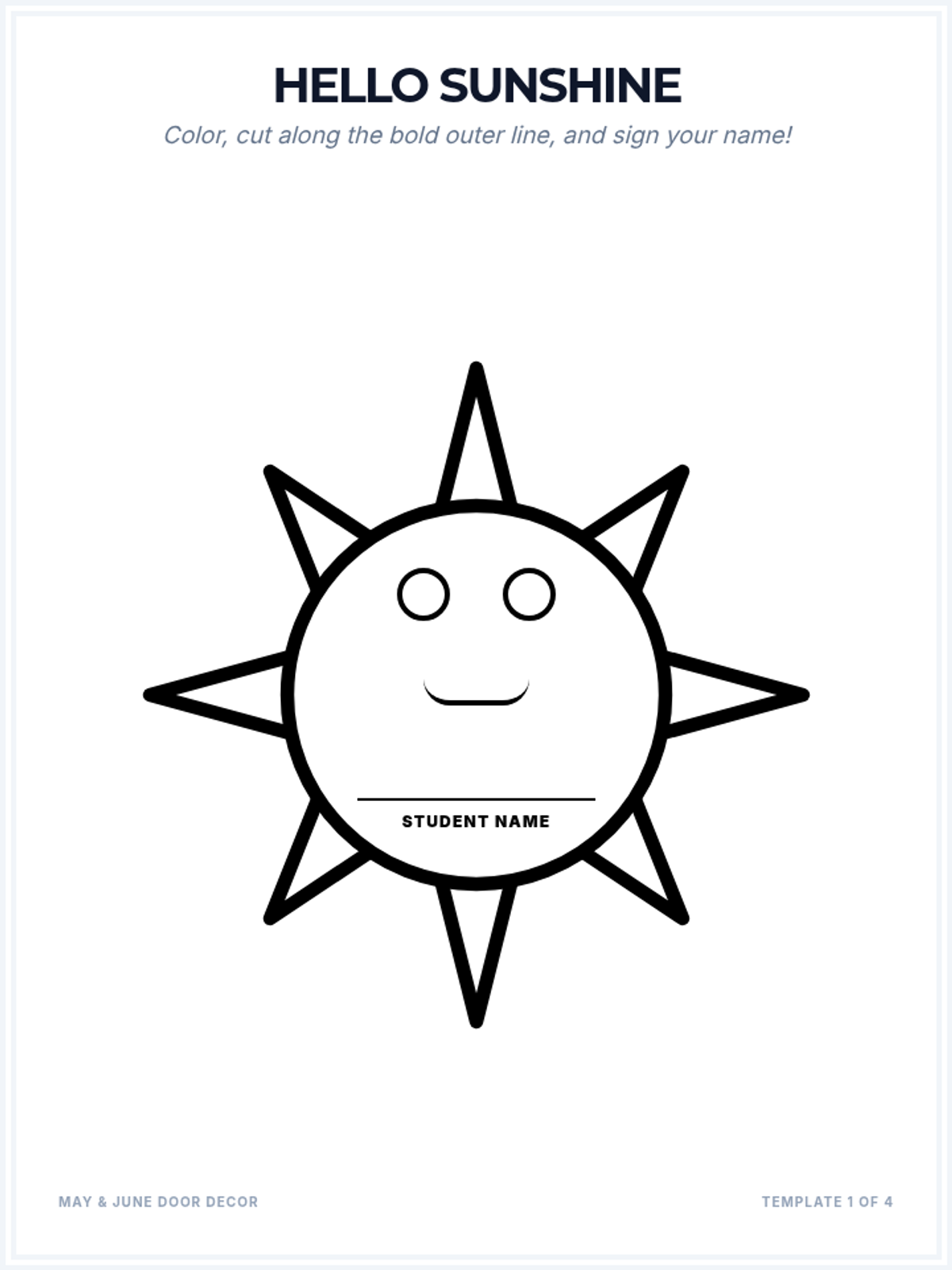 A set of four pages featuring large, easy-to-cut seasonal templates for May and June classroom door decorations. Includes a giant sun, blooming flowers, summer sunglasses, and butterflies, with high-contrast name fields. Revised for better page breaks and graphic clarity.
