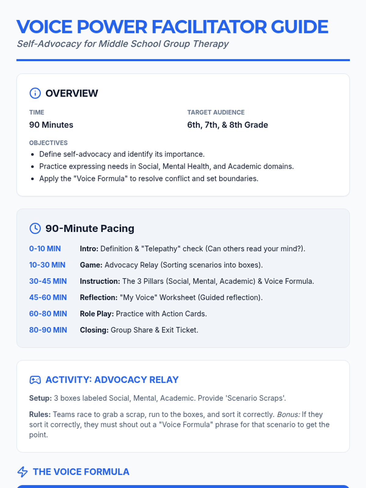 A detailed facilitator guide for a 90-minute group therapy session on self-advocacy. Includes lesson objectives, a timed pacing guide, core content summaries, and pedagogical tips for working with middle schoolers.