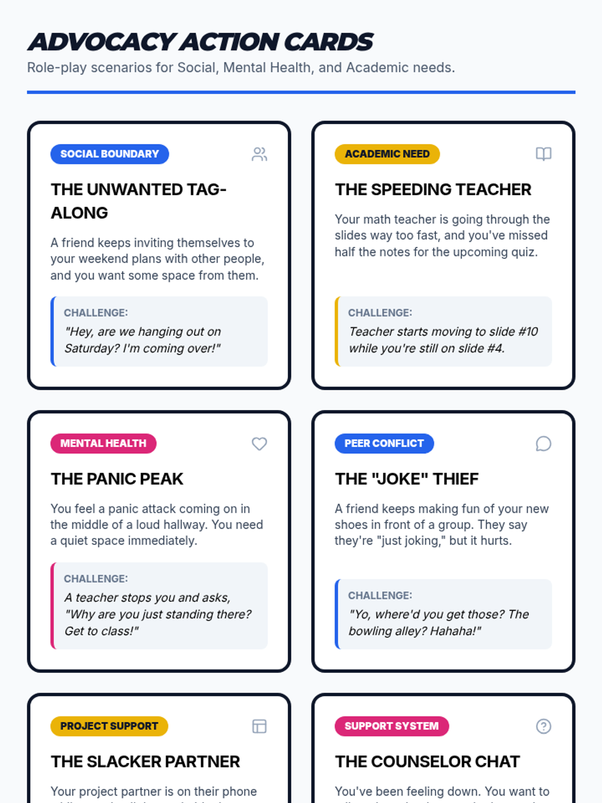Printable scenario cards for self-advocacy role-plays. Uses CSS to prevent cards from breaking across pages during printing.