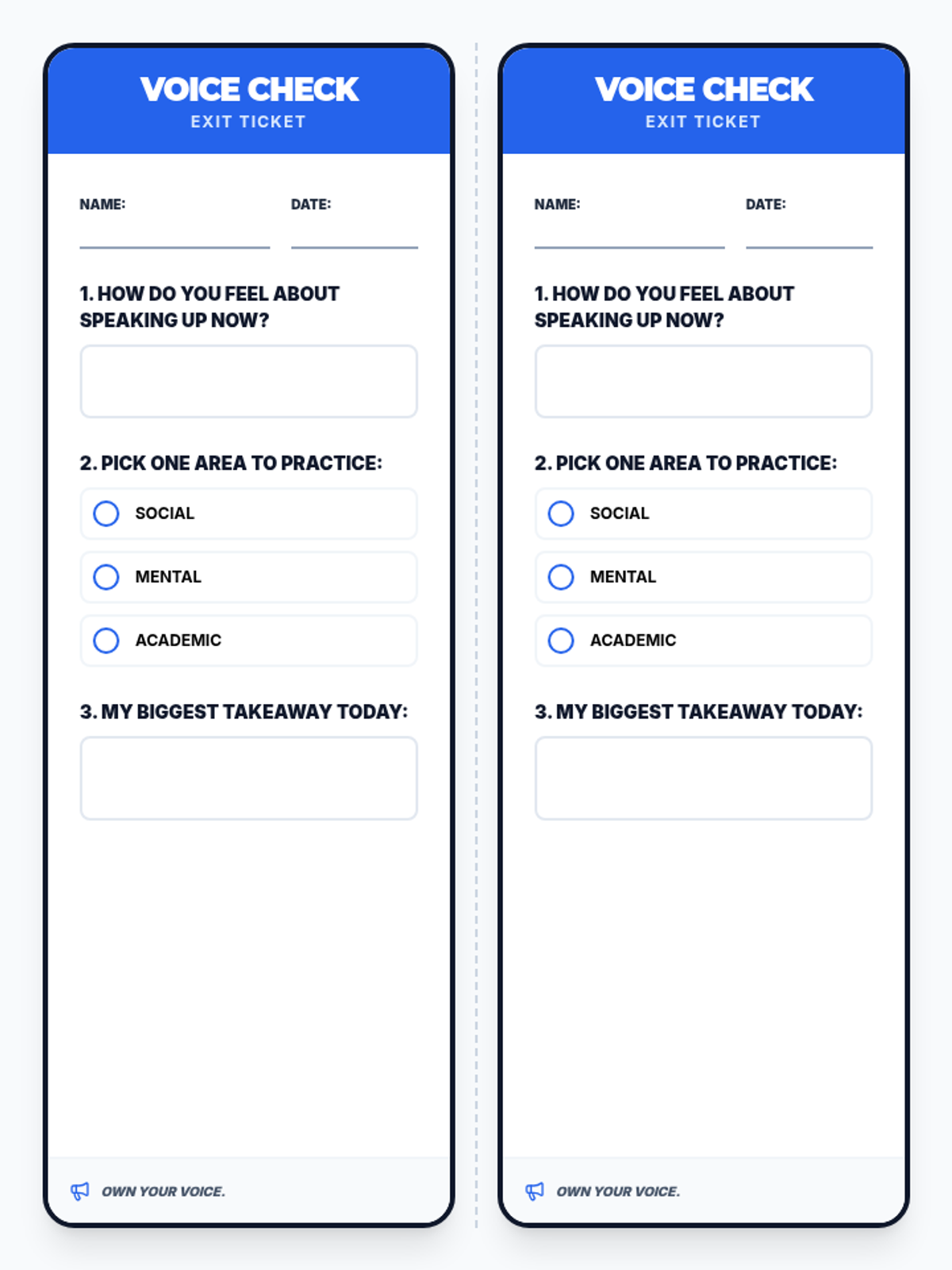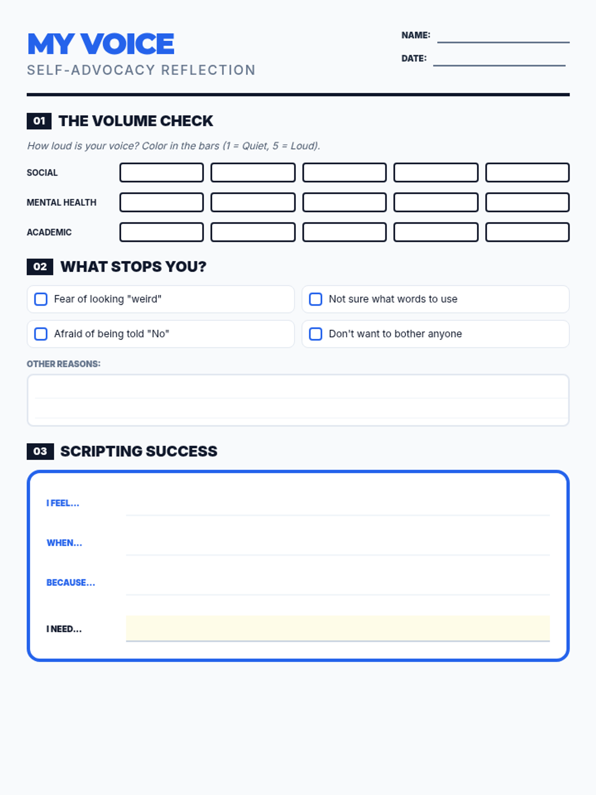A guided reflection worksheet for students to assess their comfort levels with self-advocacy and practice the Voice Formula. Features compact sections to ensure all content fits on a single page.