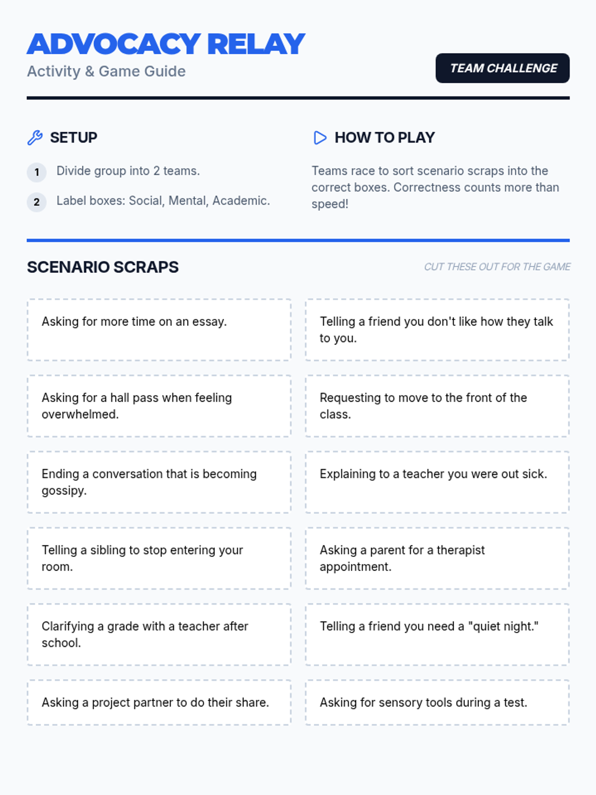Instructions and printable scenario scraps for the Advocacy Relay game. Grouped to ensure all printable pieces are on a single page for easy preparation.