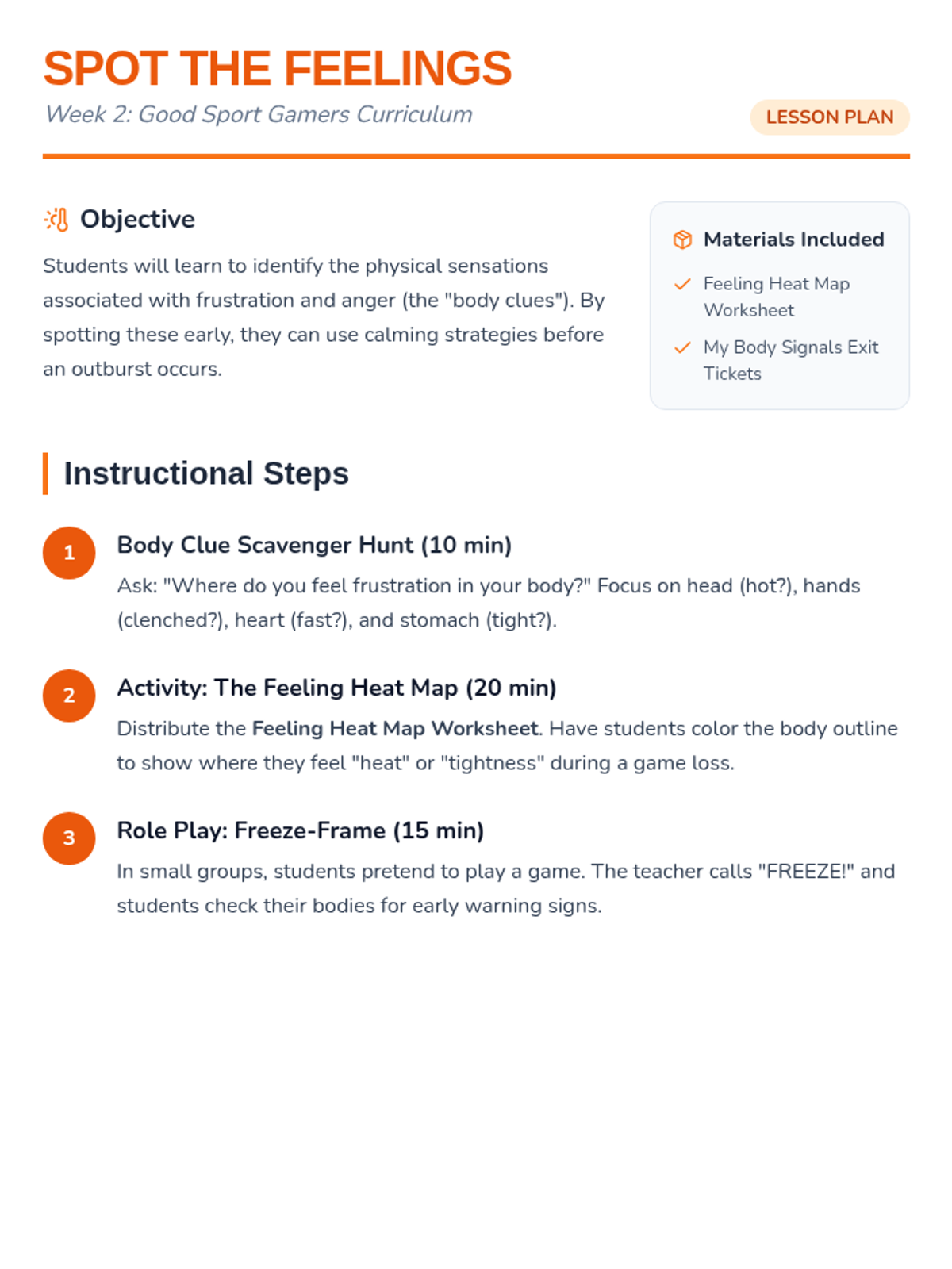 Lesson plan, "Feeling Heat Map" worksheet, and detective exit tickets for Week 2, adjusted for 30-minute session pacing with SVG and label fixes.