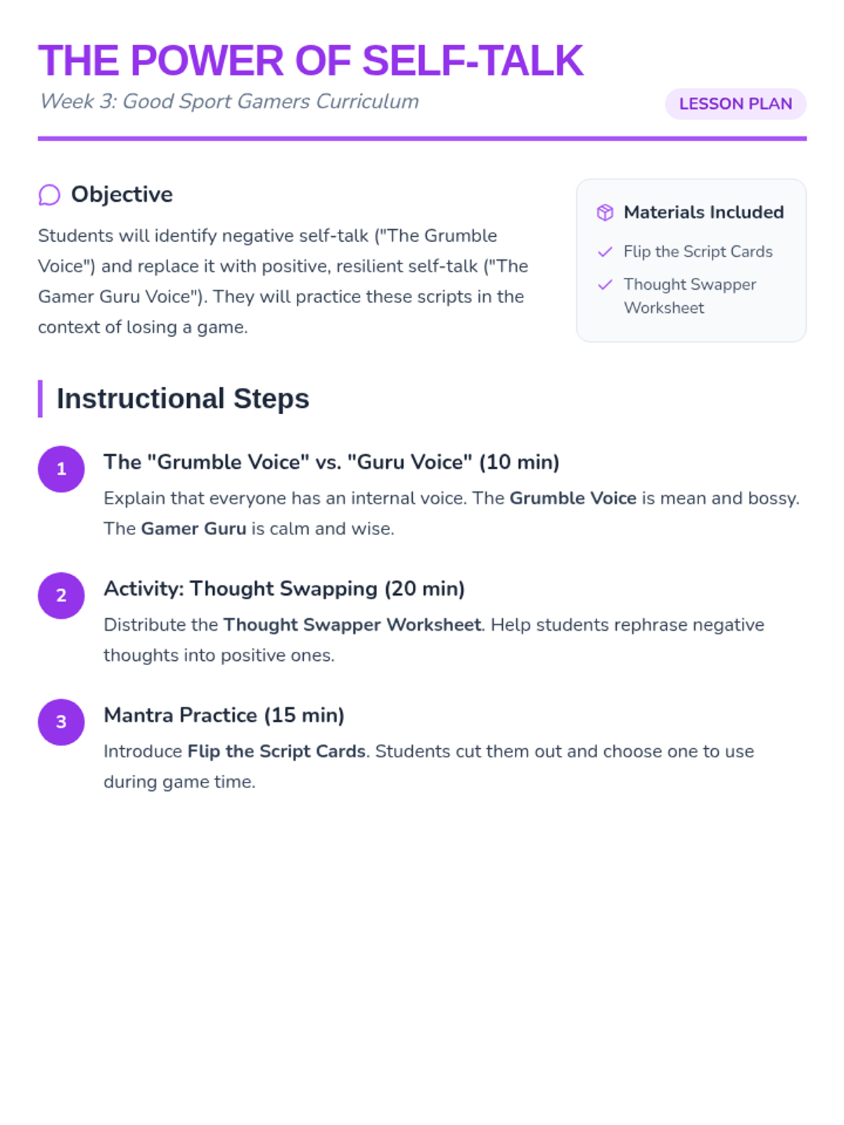 Lesson plan, scripts, and a worksheet for Week 3, adjusted for 30-minute session pacing with script examples and layout fixes.