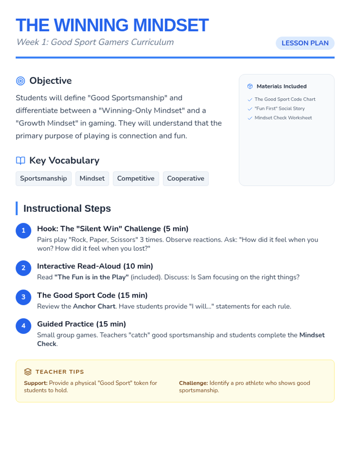 Lesson plan, social story, anchor chart, and "Mindset Check" worksheet for Week 1, adjusted for a 30-minute session pacing with layout fixes for printing.