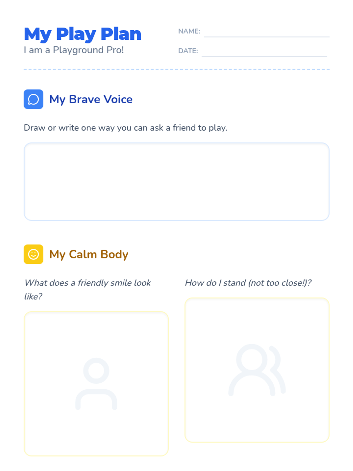 A reflective student worksheet for practicing social skills. It includes space for students to plan their 'brave voice' request, visualize calm body language, and brainstorm 'Plan B' activities for handling a 'no' response.