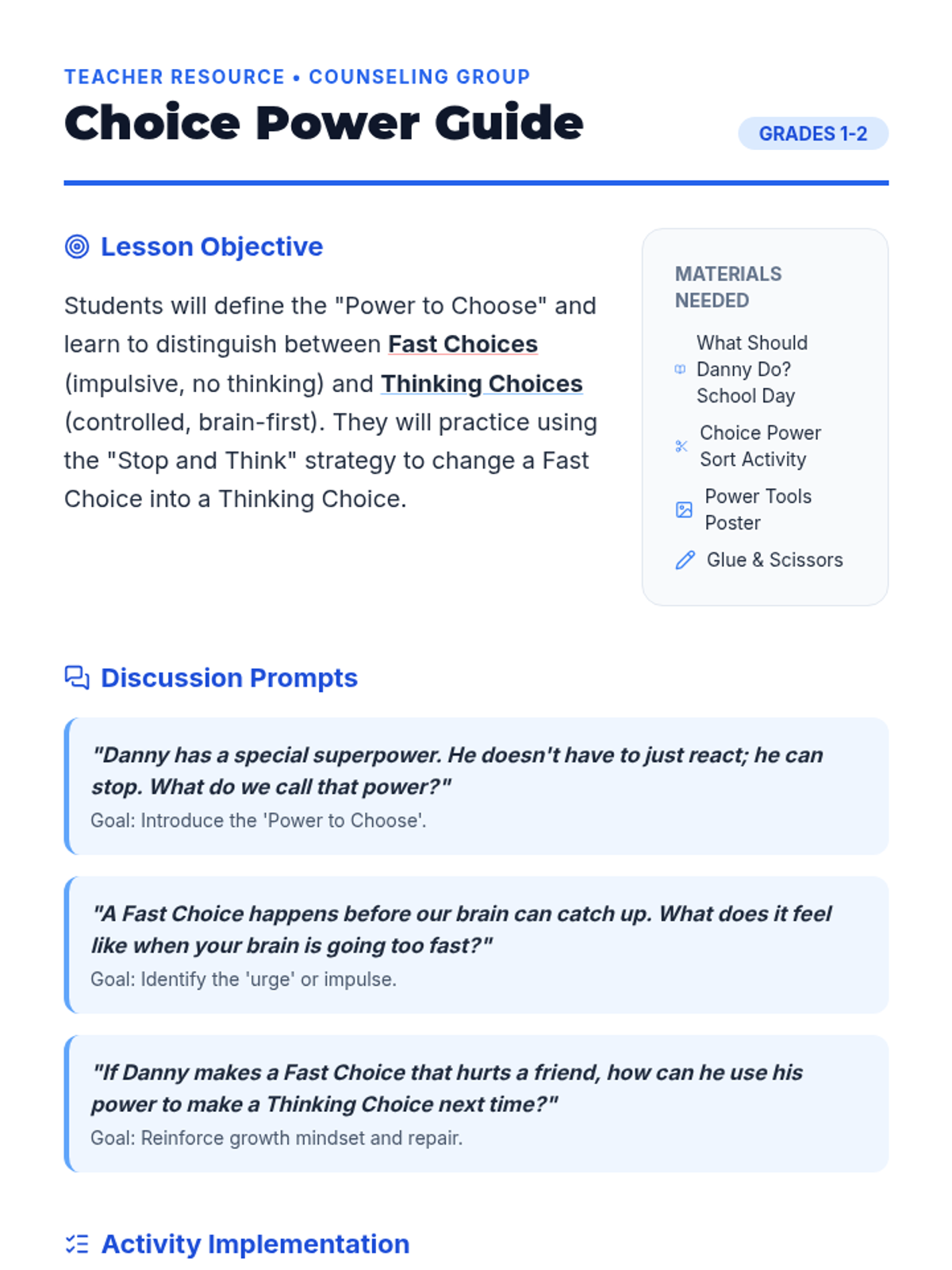 A facilitation guide for teachers or counselors to lead the 'Choice Power' lesson, focusing on 'Fast Choices' and 'Thinking Choices' to build self-control and a growth mindset.