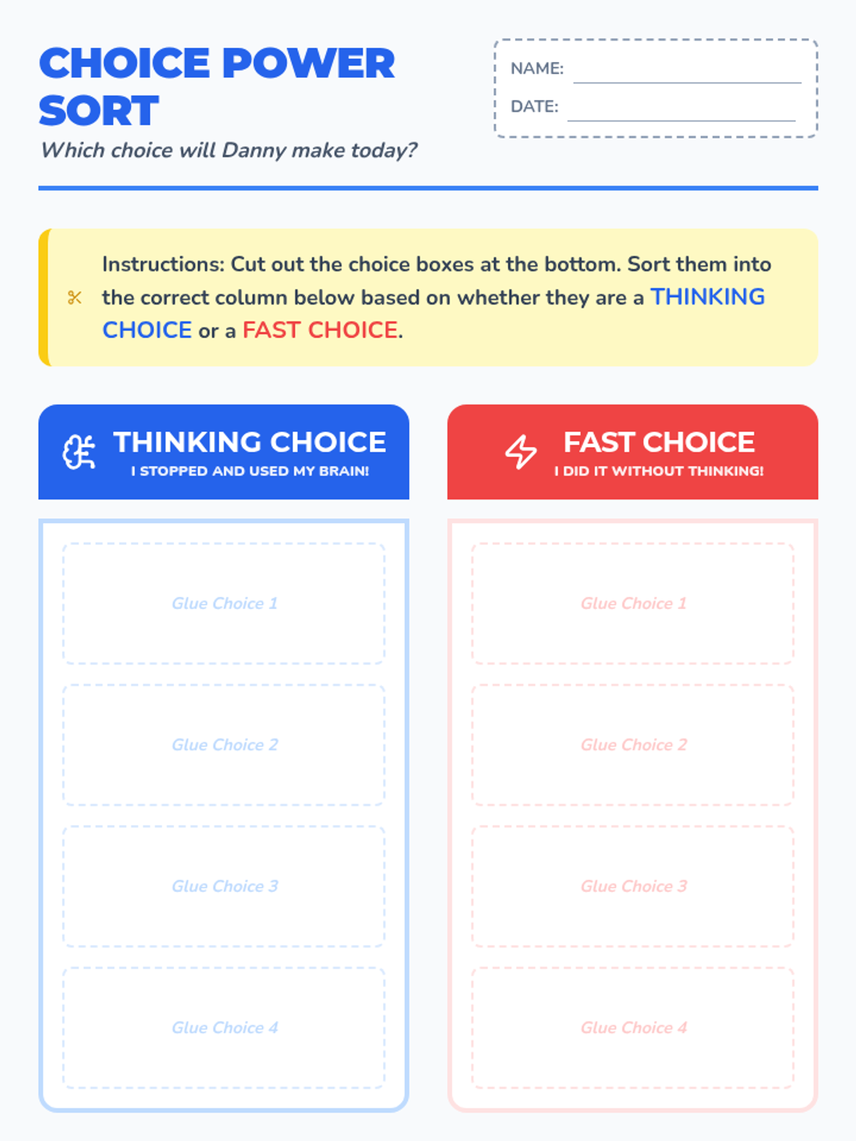 A cut-and-paste sorting activity for first and second graders to distinguish between impulsive actions (Fast Choices) and those showing self-control (Thinking Choices), inspired by the book 'What Should Danny Do?'.