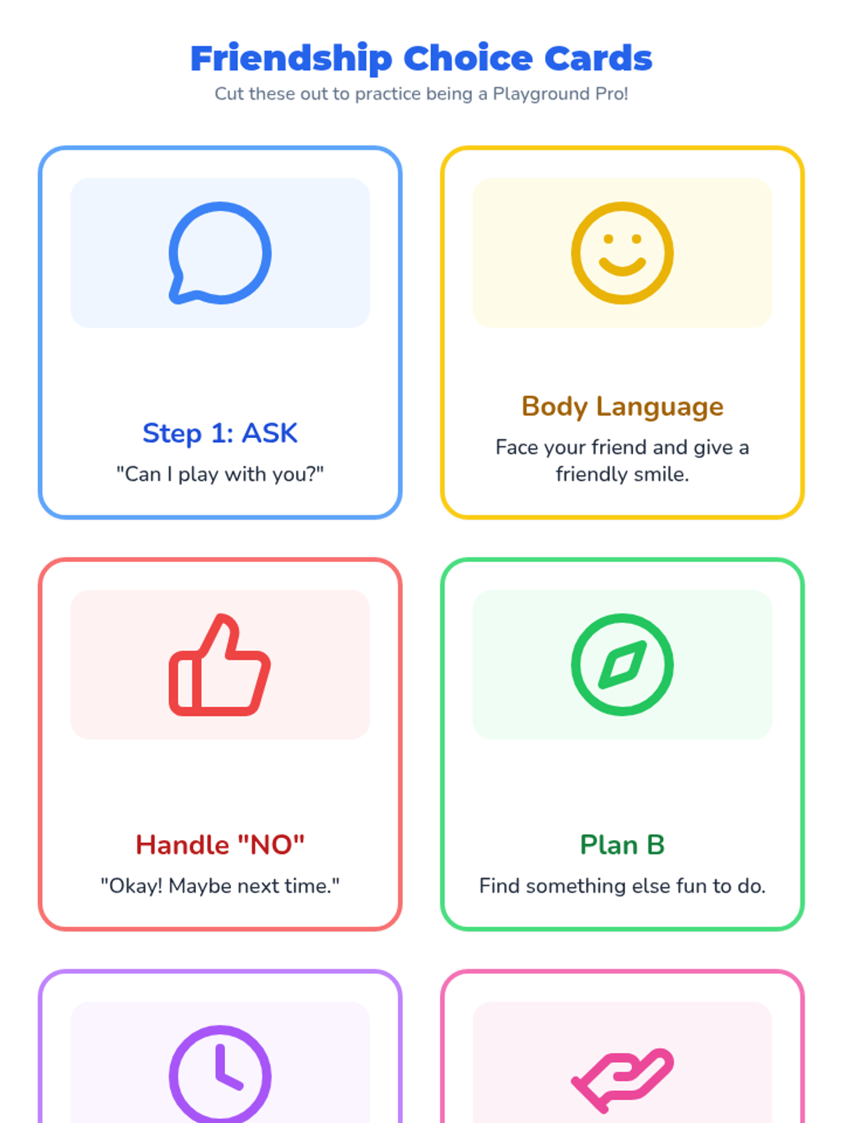 A set of visual prompt cards for students to use during role-play or as a desk reference. The cards include key phrases and body language reminders for asking to play and handling rejection gracefully.