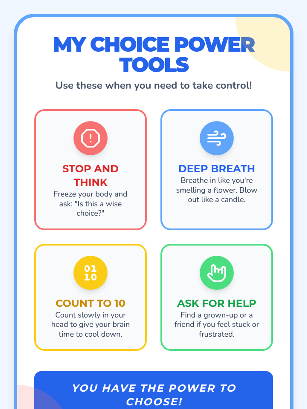 A colorful reference poster identifying four specific self-control strategies (Stop and Think, Deep Breath, Count to 10, Ask for Help) to help students exercise their 'Power to Choose', optimized for a single-page layout.