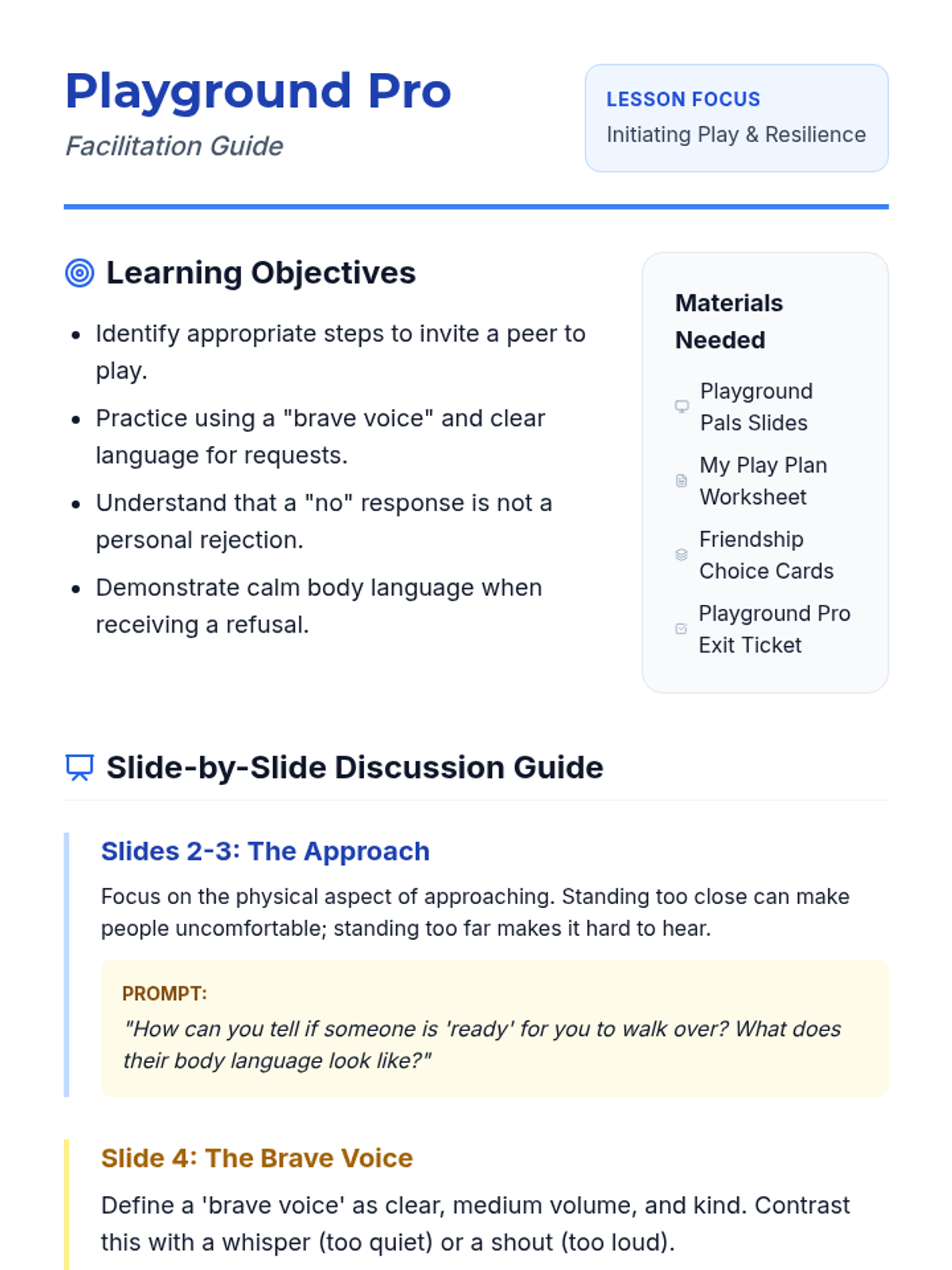 A comprehensive teacher's guide for the Playground Pals lesson. It includes learning objectives, slide-by-slide discussion prompts, role-play scenarios, and differentiation strategies to support all learners.