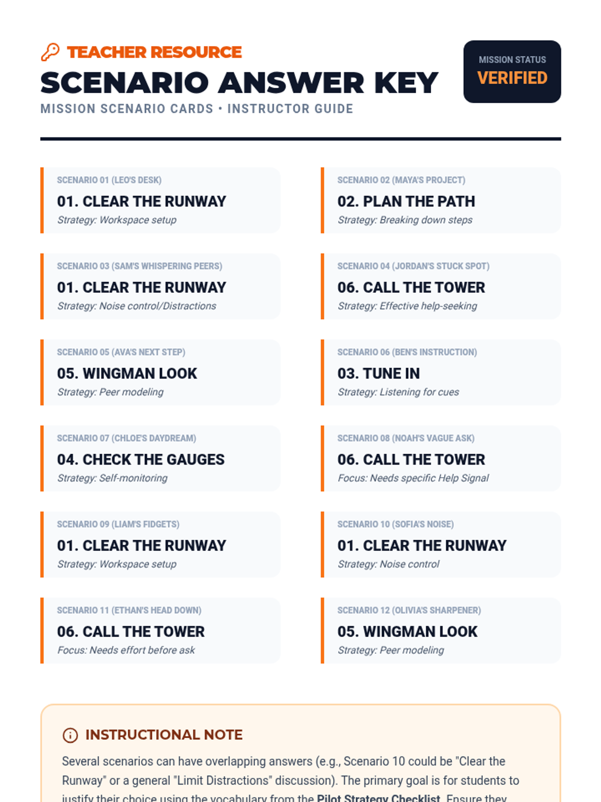An answer key for the Mission Scenario Cards, providing the correct executive functioning strategy for each of the twelve classroom challenges.