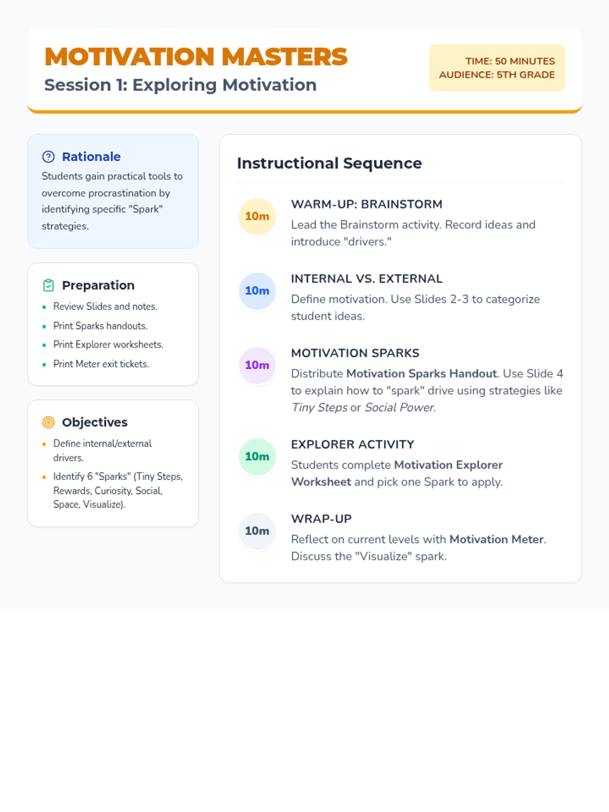 Updated lesson plan for Session 1 of Motivation Masters, now including a 10-minute segment dedicated to "Motivation Sparks" strategies and internal/external drivers.