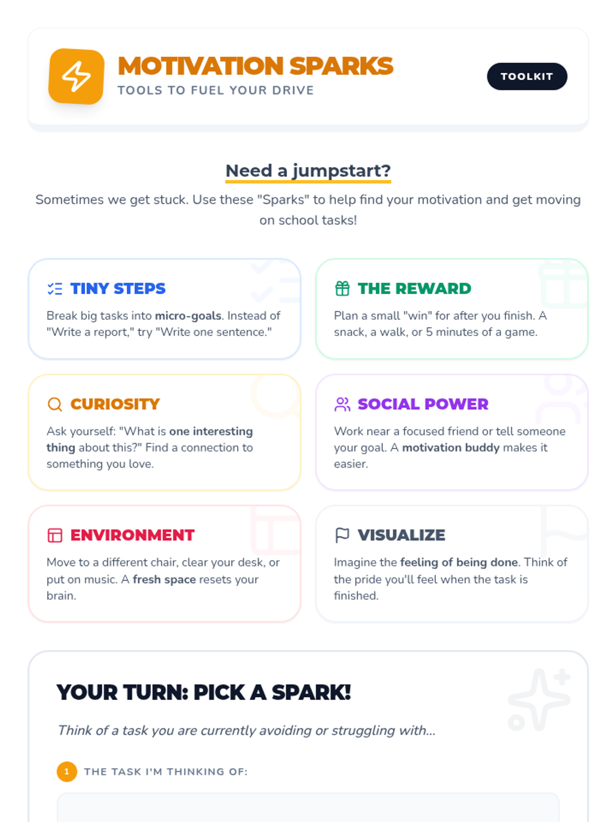 A handout listing six practical strategies (Motivation Sparks) for students to increase their drive for school tasks, including setting tiny goals, environment changes, and social support.