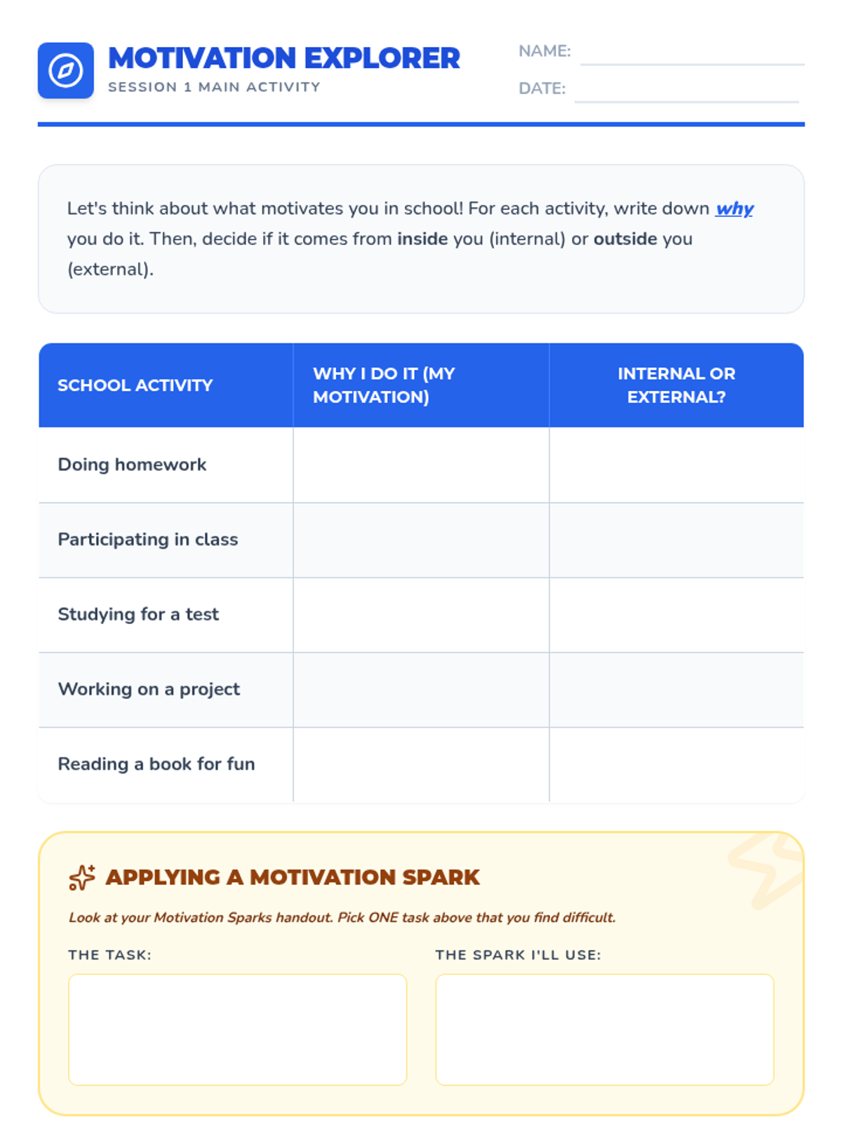 Updated Motivation Explorer worksheet now featuring a "Applying a Motivation Spark" section where students can choose a strategy from the handout to address a difficult task.