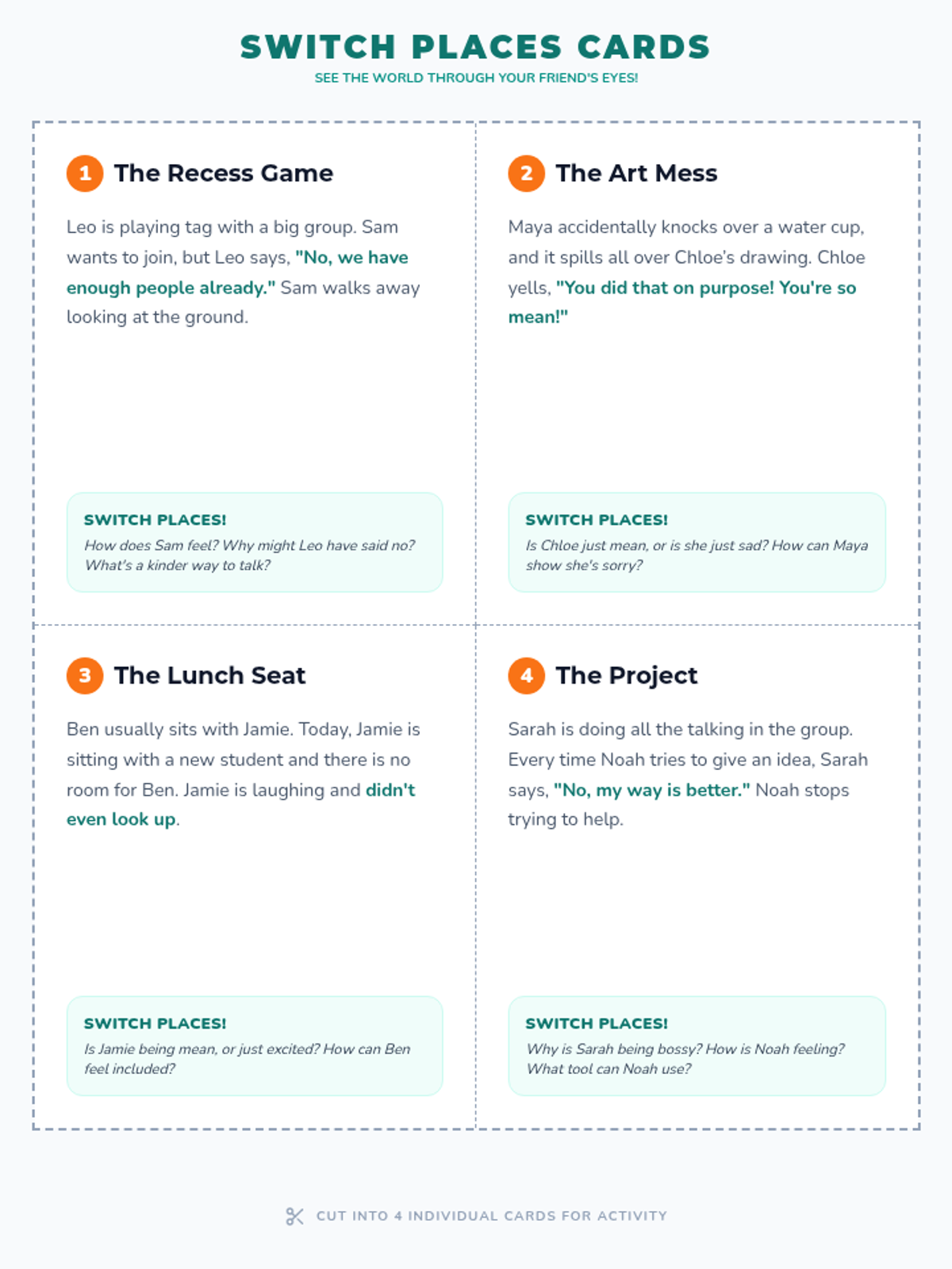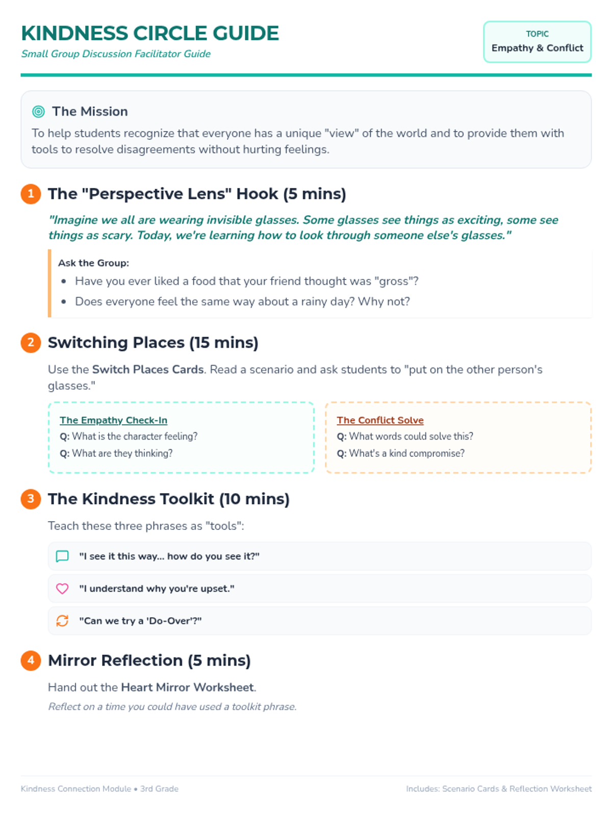 A teacher-facing guide for facilitating a small group discussion on empathy and conflict resolution for 3rd graders. Includes structured discussion points, specific questioning strategies, and instructional 'tools' for students. Revised for single-page printing.