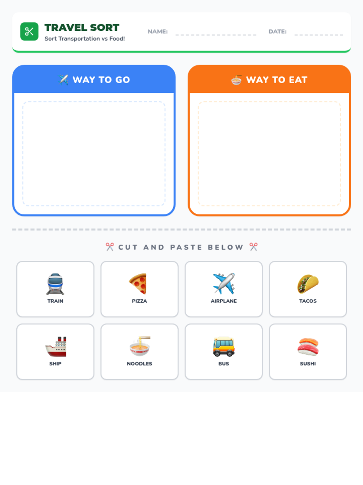 A hands-on cut-and-paste activity where students categorize transportation methods and global foods, featuring clear visual icons and designated sorting zones.