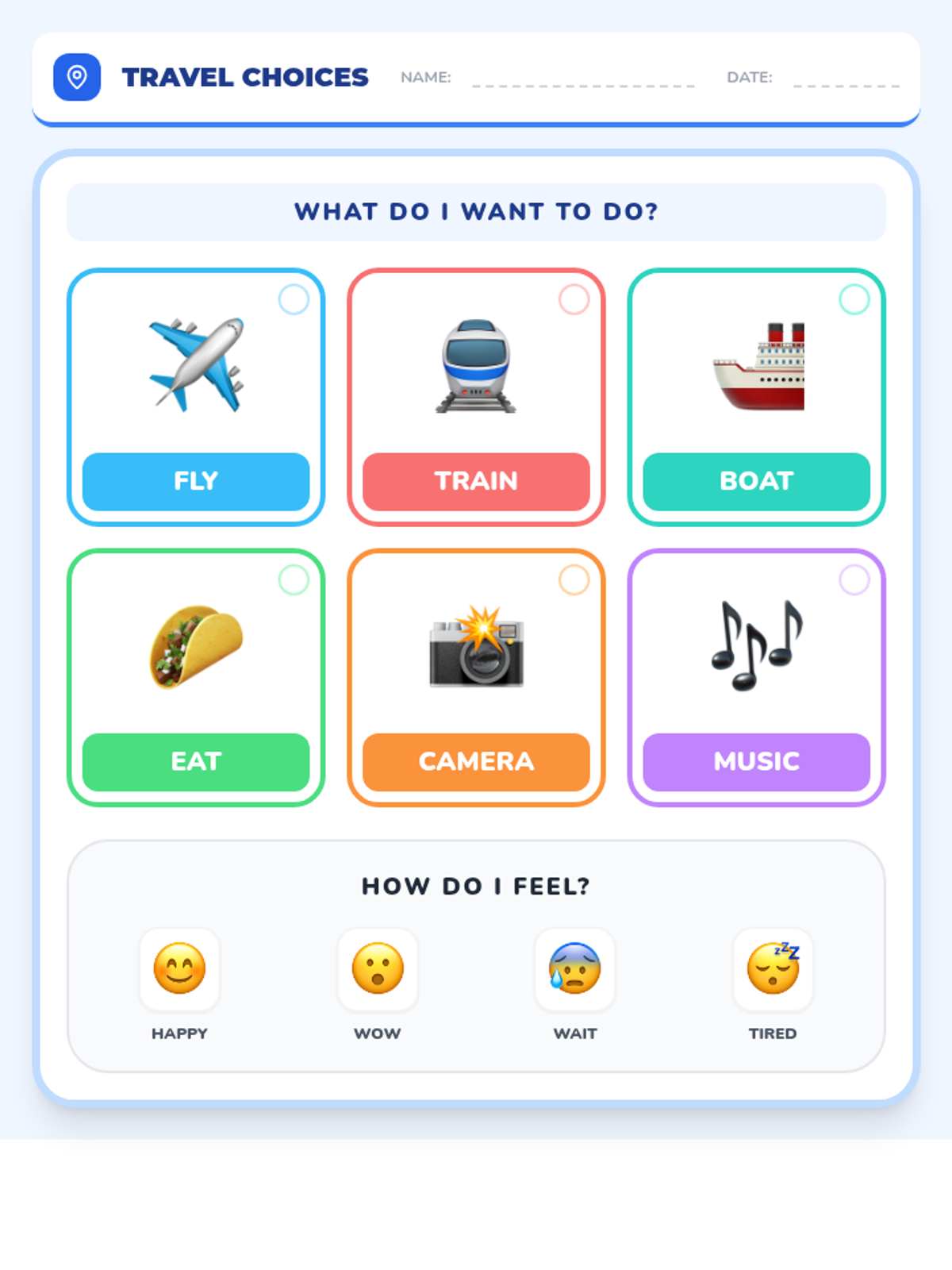 A high-visual communication tool for students to express preferences regarding travel methods and activities, including sensory experiences and an emotional check-in bar.