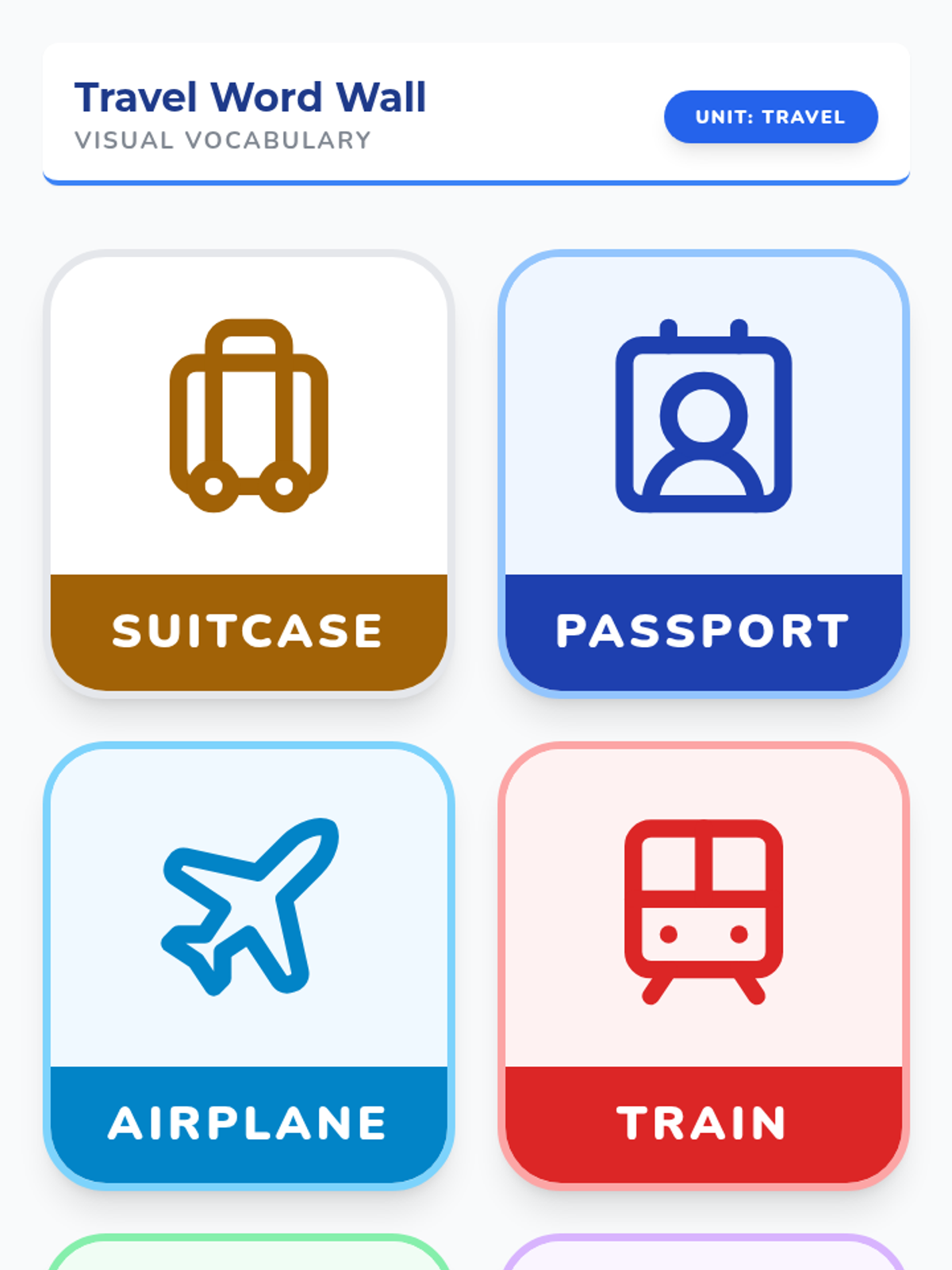 Large, high-contrast vocabulary cards featuring travel-related words like Suitcase, Passport, Airplane, Train, Food, and Tradition with clear icons and bold text for classroom display and student reference.