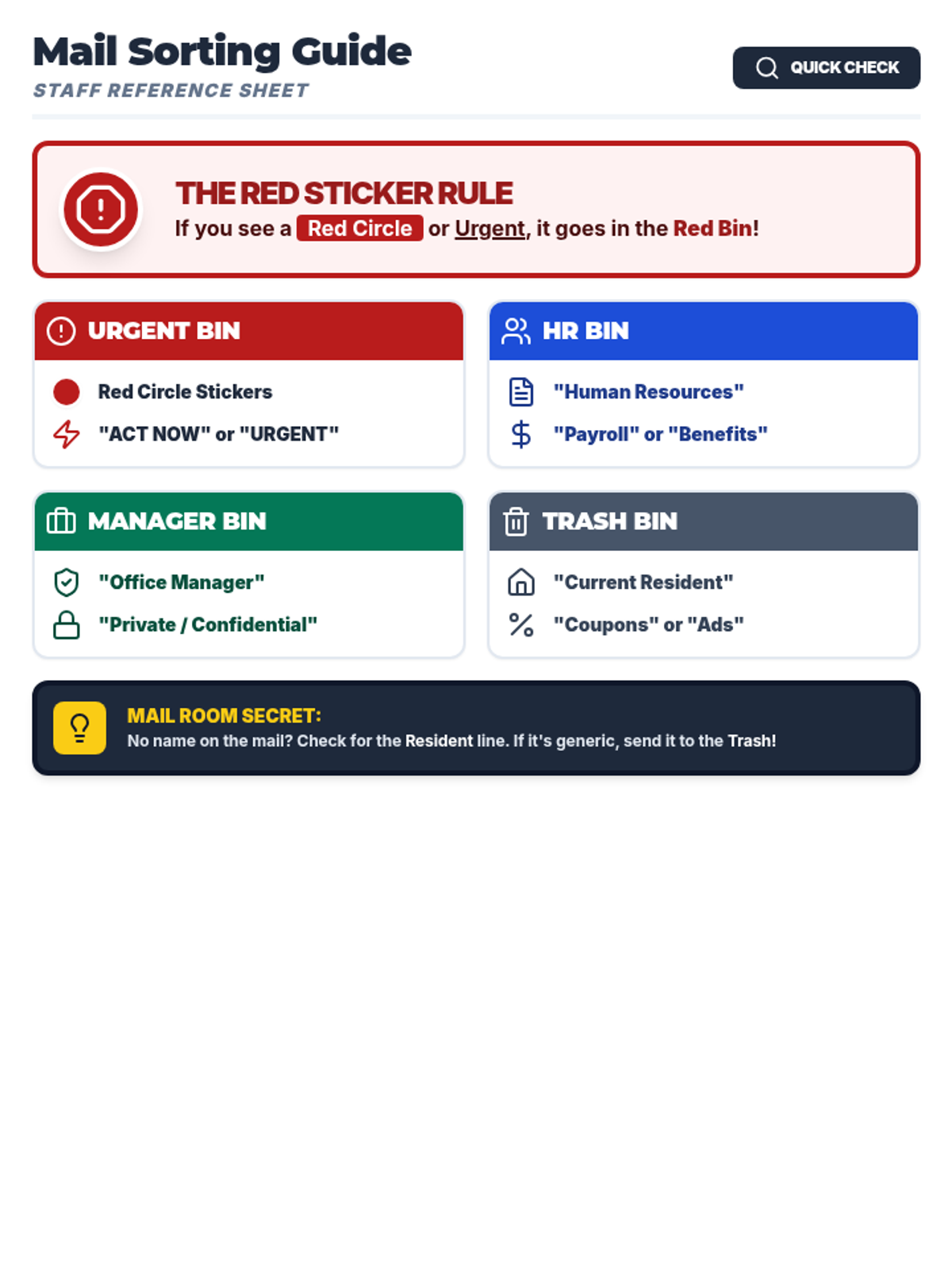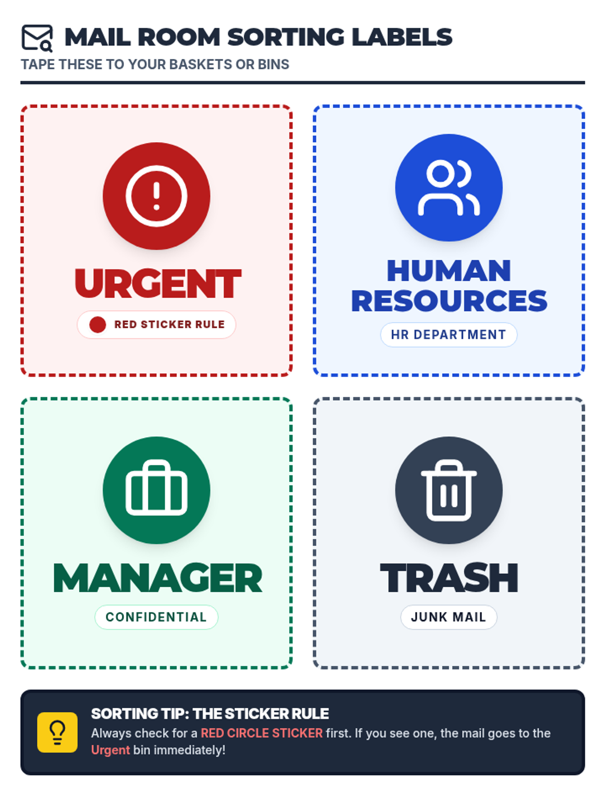 Large, color-coded labels for mail bins including HR, Manager, Trash, and Urgent categories with visual icons and a specific 'Red Sticker' rule indicator.
