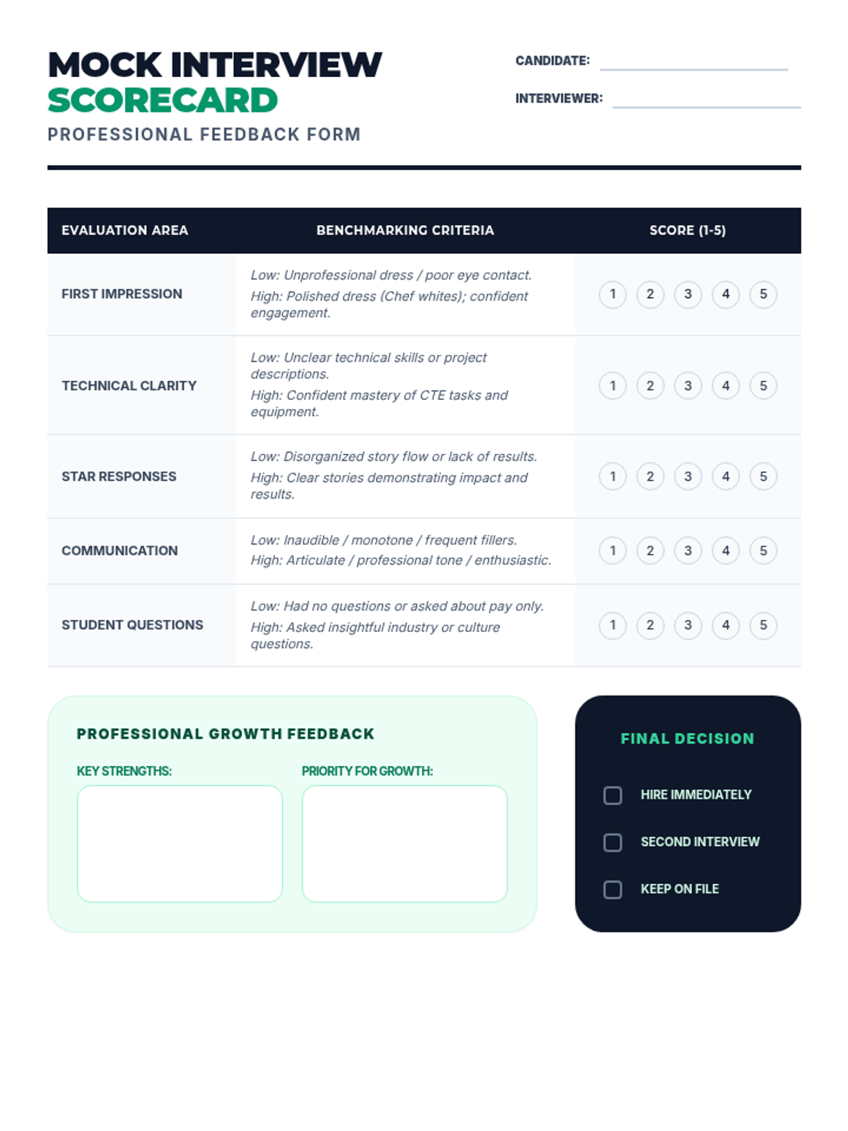 An evaluation scorecard for mock interviews, providing structured feedback on first impressions, technical clarity, response structure, and professional presence.