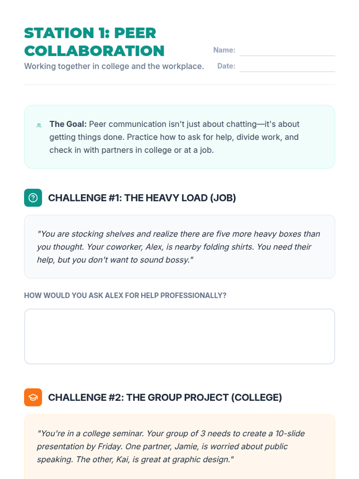 Peer Collaboration worksheet where students practice professional communication skills like asking for help, coordinating tasks, and checking in with coworkers.