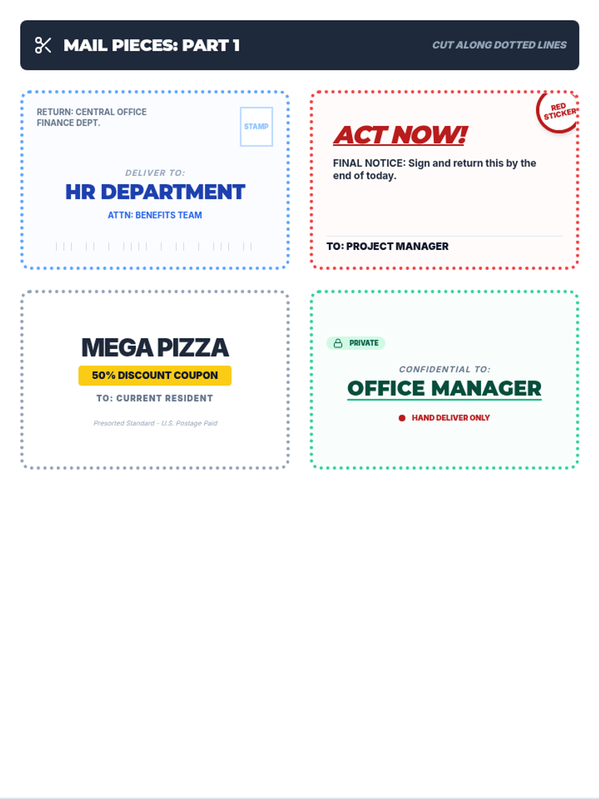A set of printable 'mail' items including envelopes for HR, postcards with 'Urgent' stamps, manager-specific correspondence, and junk mail advertisements for a sorting activity.