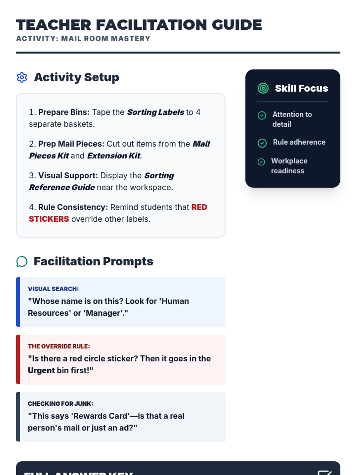 Instructional guide for teachers outlining setup steps, verbal prompts for students, and an answer key for the mail sorting activity.