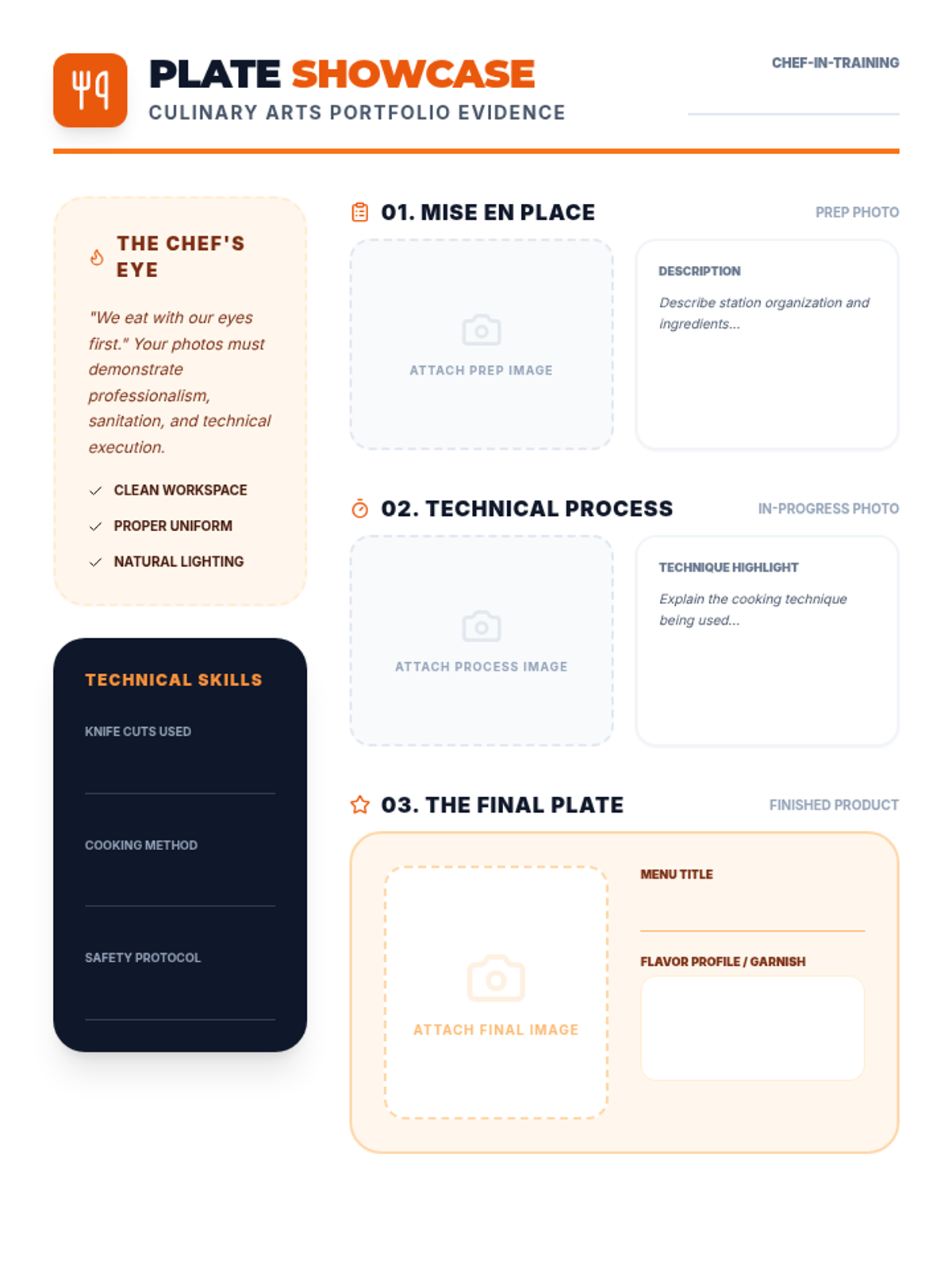 A specialized culinary evidence template for students to document their Mise en Place, technical process, and final plate presentations with accompanying descriptions.